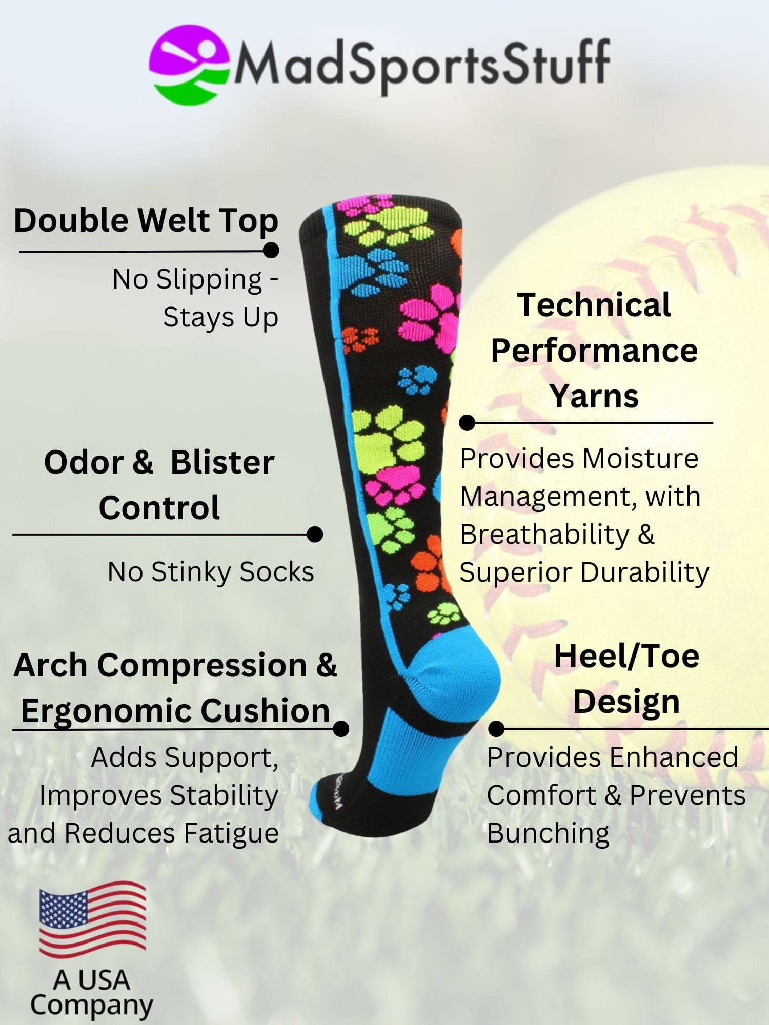 MadSportsStuff Crazy Paw Socks, Over the Calf. High performance athletic paw socks for all team sports and elite athletes. For boys or girls, teams and gifts. Ideal for softball, baseball, lacrosse, basketball, field hockey, volleyball, wrestling, soccer, football, cheer, kickball and more!