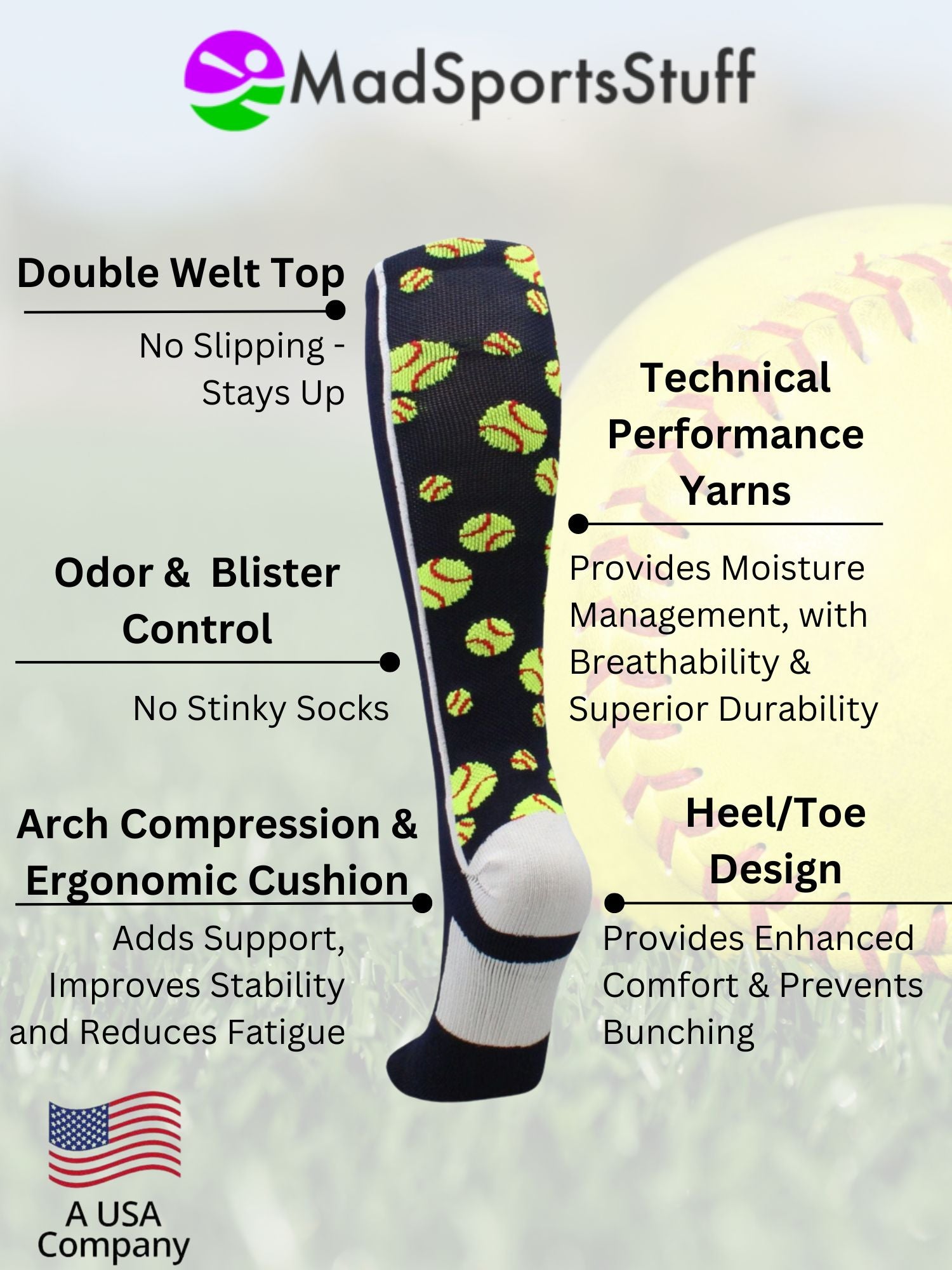 MadSportsStuff Crazy Softball Socks with Softballs Logo Over the Calf. High performance crazy softball socks for all team sports and elite athletes. These crazy softball socks are great for girls, teams and gifts.