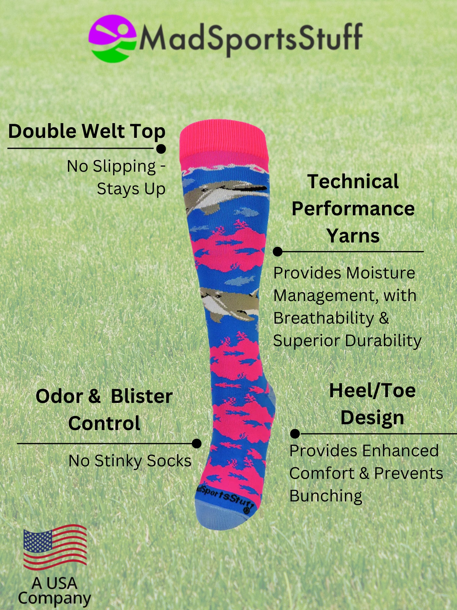 MadSportsStuff Happy Dolphins Athletic Over the Calf Socks. High performance athletic socks for all team sports and elite athletes.