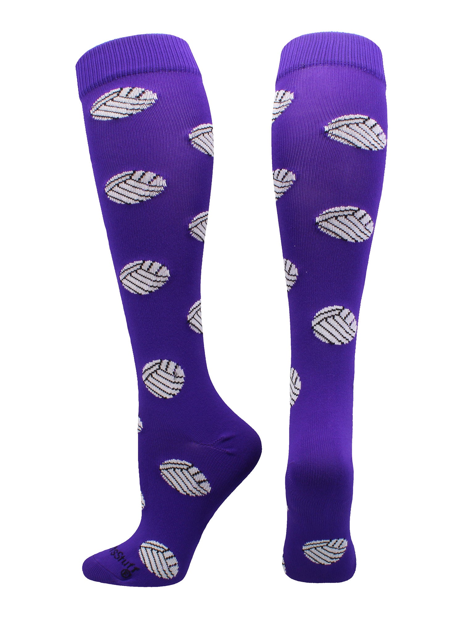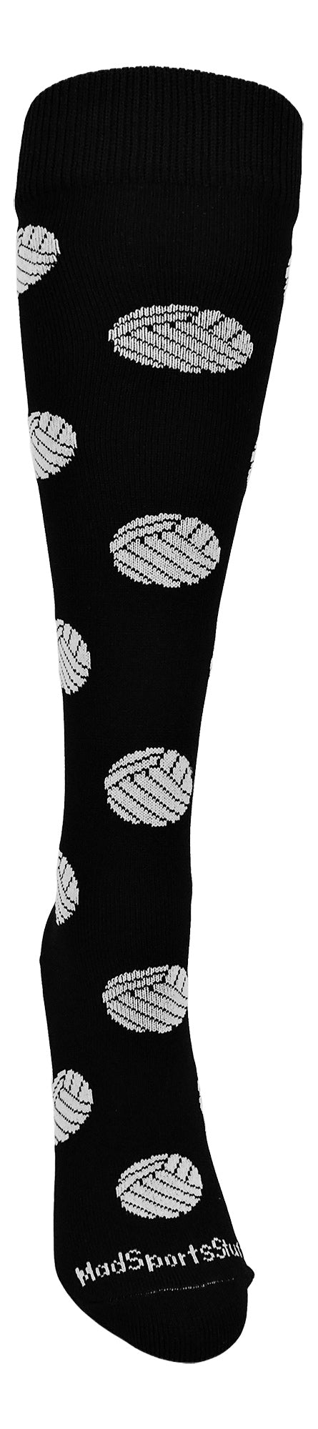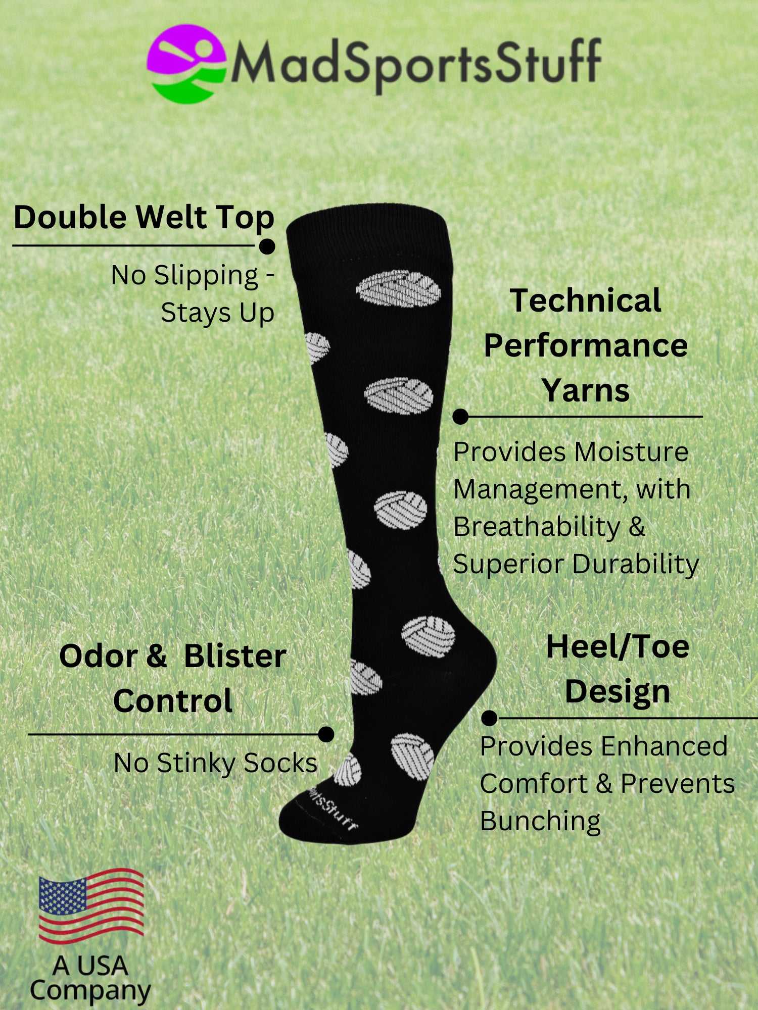 MadSportsStuff Volleyball Socks with Volleyball Print in an over the calf length. High performance athletic socks for all team sports and elite athletes. Fiber Contents: 75% Polypropylene, 13% Nylon, 9% Elastic, 3% Lycra Spandex.