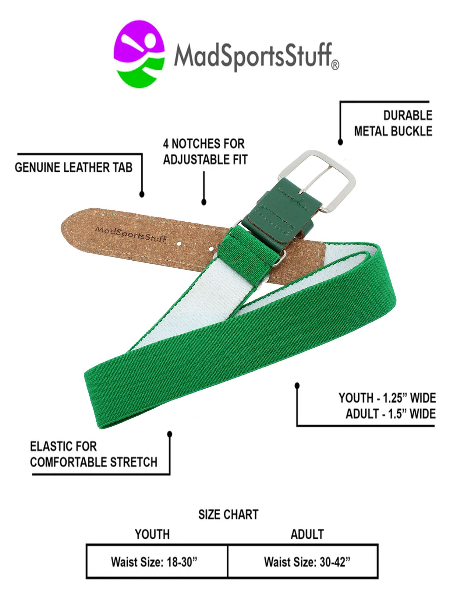 - BELT SIZING: Youth belt is 1.25 inches wide and fits a waist size of 18-30 inches. The adult belt is 1.5 inches wide and fits a waist size of 30-42 inches.