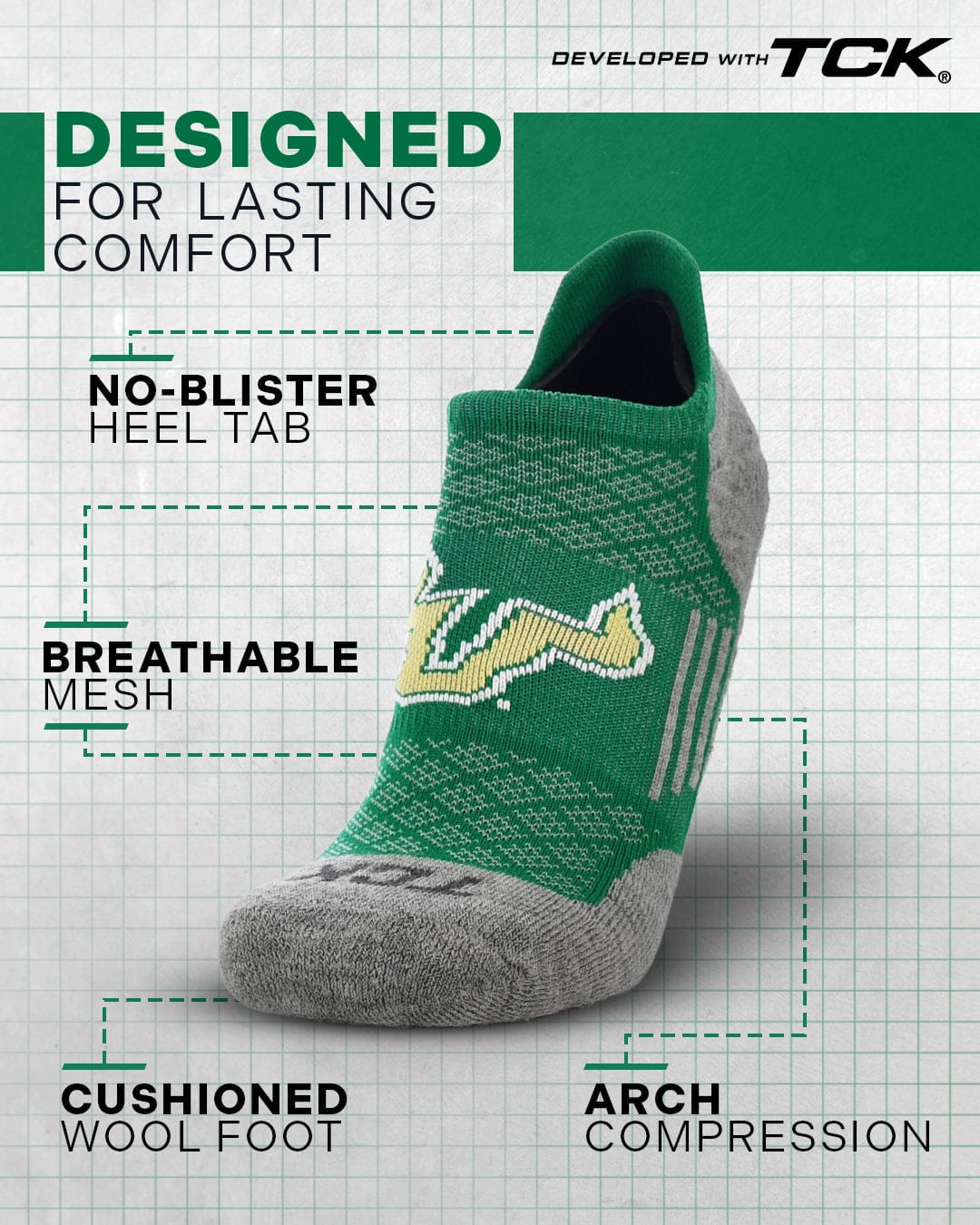 Step up your sock game with TCK's South Florida Bulls no show socks, high performance NCAA sock made in the USA. Designed for sneakerheads, golfers, runners, and fans alike, these socks feature a soft merino wool footbed, breathable mesh upper, arch support, and a smooth toe seam. The heel tab protects without showing. Perfect for all-day comfort, year-round wear, and gifting for birthdays, Father's Day, grads, or Christmas.