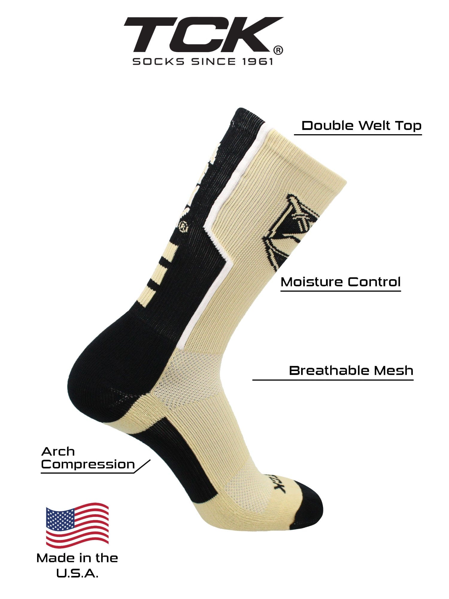 Wear your loud and proud school pride on your feet and be ready for even the most strenuous activities. Perfect with sneakers and slides, these socks let you be athletic ready while you support your school. Offering comfort, breathability, performance, and durability these high quality Army West Point Academy socks are an ideal gift for Father's Day, birthdays, stocking stuffers or going back to school. Made up of 77% Polypropylene, 17% Nylon, 3% Elastic, 3% Lycra Spandex. Go Knights!