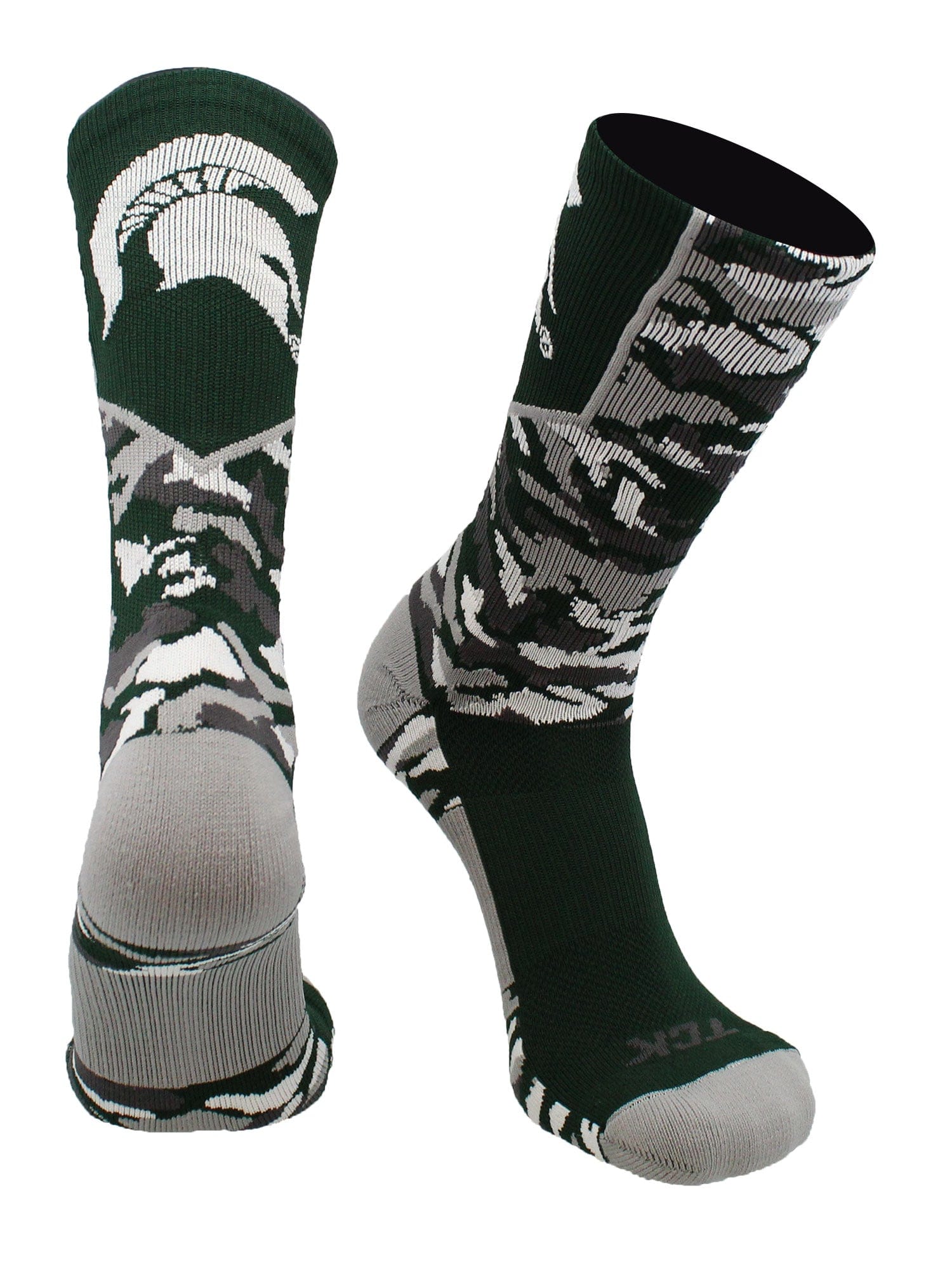 - GO GREEN, GO WHITE: Join the Spartan faithful in style with these officially licensed Michigan State socks. Featuring authentic Spartan Green and White in a rugged woodland camo design, they are the perfect gear for gamedays at Spartan Stadium or the Breslin Center. Whether you’re celebrating a touchdown or a buzzer-beater, show your pride from head to toe.