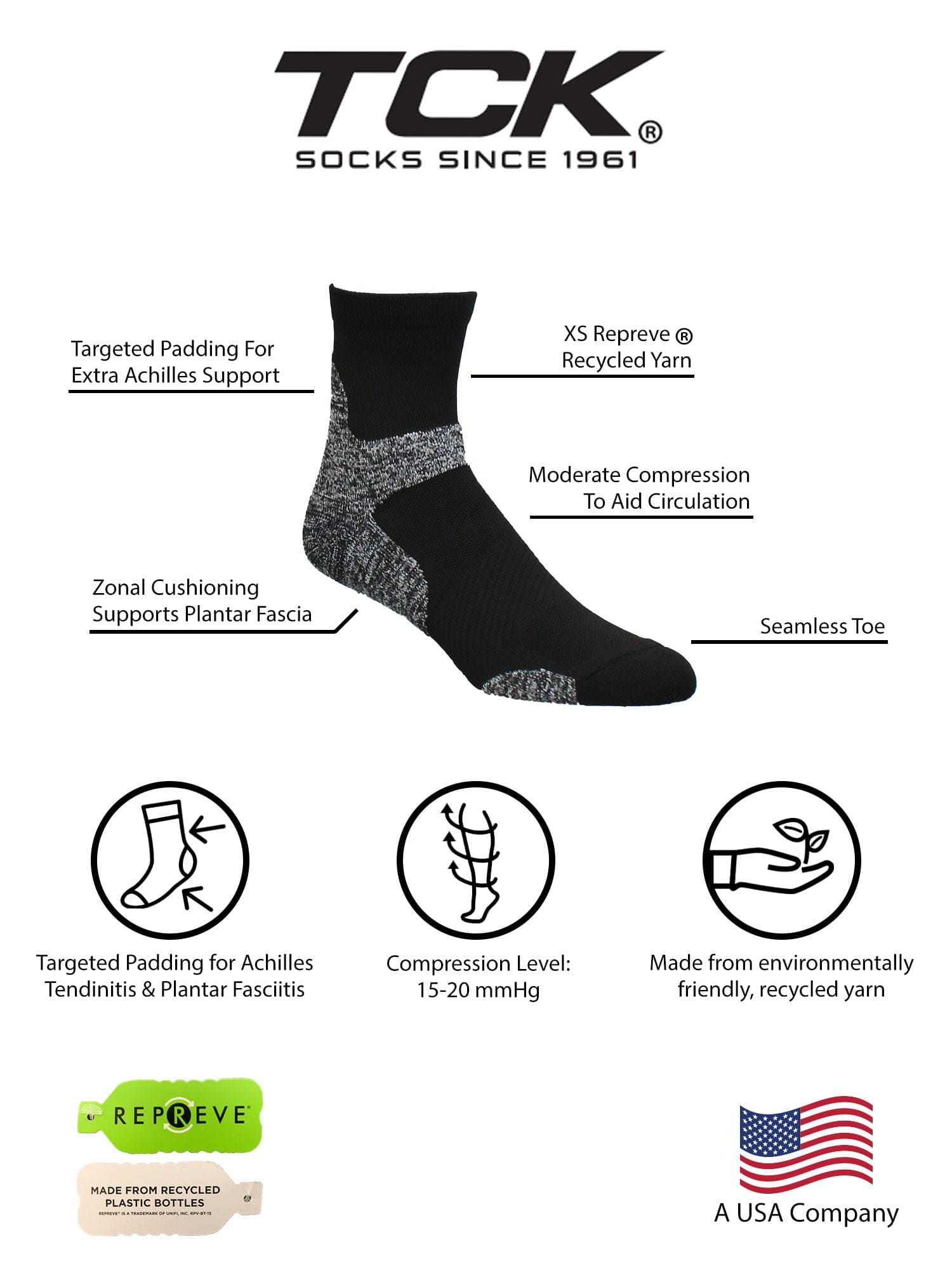 TCK Achilles Tendonitis Support Socks provide light compression and extra padding to protect the Achilles. These compression socks target and help prevent Achilles and Plantar Fasciitis, foot fatigue, arch pain, heel pain, enhance circulation, and reduce fatigue. Durable and breathable materials were used while making these socks. These socks will endure the demands of daily use while keeping your foot cool and dry. Made in the USA. TCK was founded in 1961 in North Carolina.