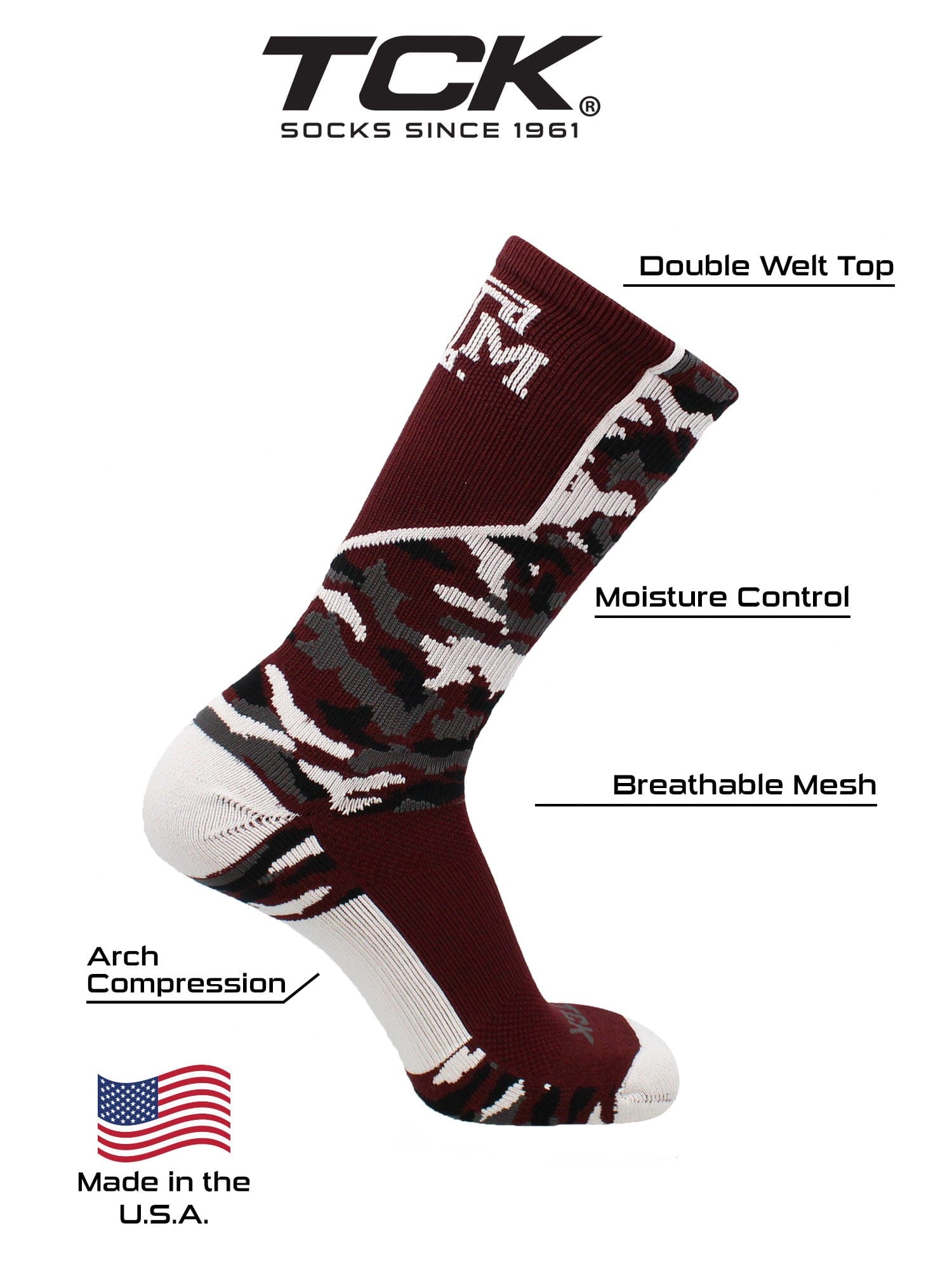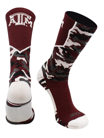 - GIG 'EM AGGIES: Join the 12th Man in style with these officially licensed Texas A&M socks. Featuring authentic Maroon and White in a rugged woodland camo design, they are the perfect gear for gamedays at Kyle Field or Midnight Yell. Whether you’re cheering with Reveille or "sawing 'em off" in the stands, show your Aggie pride from head to toe.