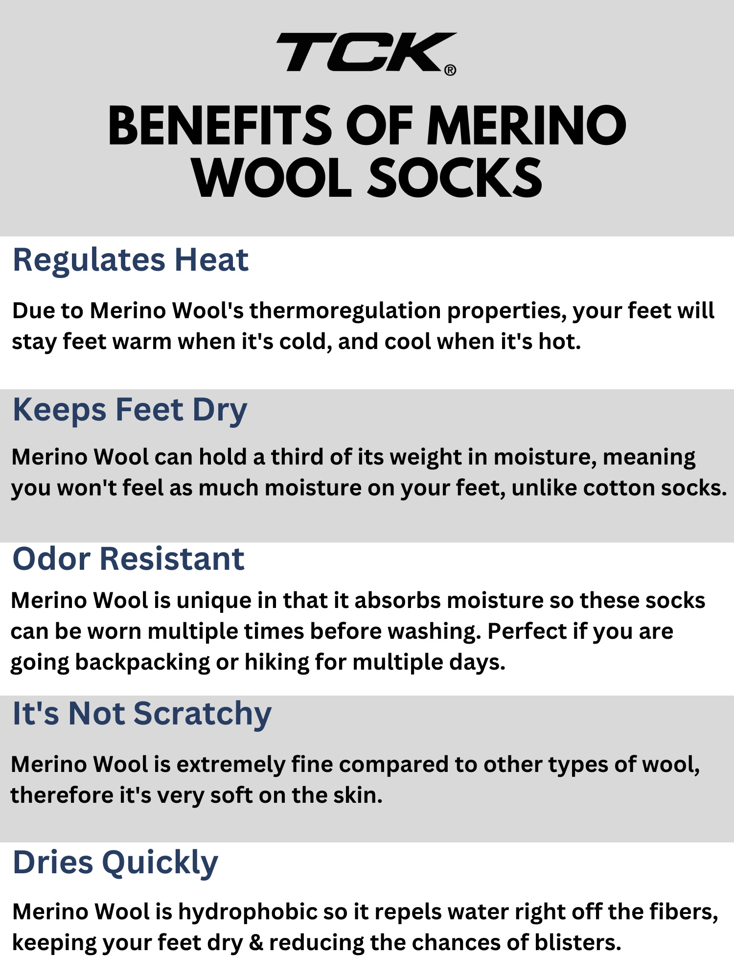 - COMFORTABLE MERINO WOOL SOCKS: Merino wool helps regulate heat, keeping you warm in the winter and cool in the summer. The perfect all weather sock! We use high quality yarns that naturally keep moisture away from skin, meaning less blisters. TCK socks are made with advanced yarns to help control odors. The wool fibers also dry quickly for multi-day use. Double welt ensures the sock stays up. This crew style sock hits just below the calf. We think these will be your favorite socks!