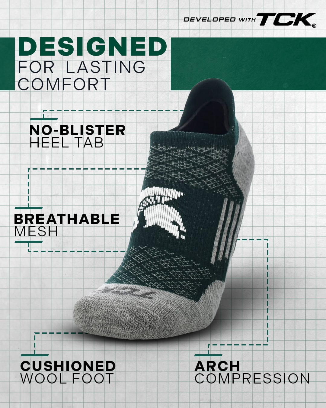 Step up your sock game with TCK's Michigan State Spartans no show socks, high performance NCAA sock made in the USA. Designed for sneakerheads, golfers, runners, and fans alike, these socks feature a soft merino wool footbed, breathable mesh upper, arch support, and a smooth toe seam. The heel tab protects without showing. Perfect for all-day comfort, year-round wear, and gifting for birthdays, Father’s Day, grads, or Christmas.
