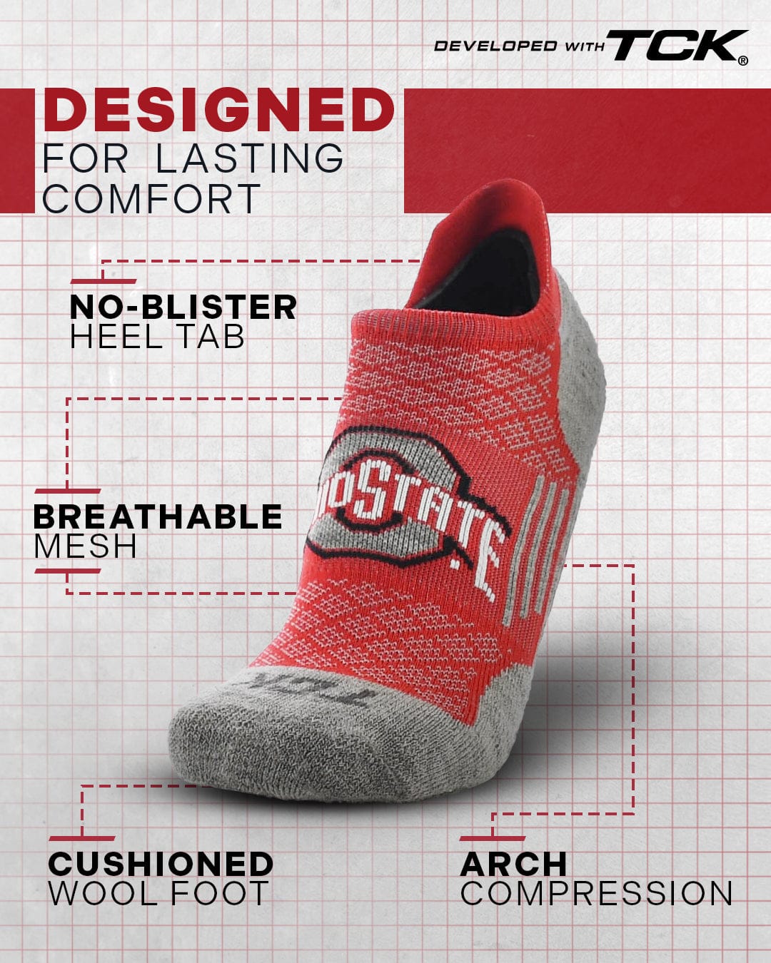 Step up your sock game with TCK's Ohio State Buckeyes no show socks, high performance NCAA sock made in the USA. Designed for sneakerheads, golfers, runners, and fans alike, these socks feature a soft merino wool footbed, breathable mesh upper, arch support, and a smooth toe seam. The heel tab protects without showing. Perfect for all-day comfort, year-round wear, and gifting for birthdays, Father's Day, grads, or Christmas.