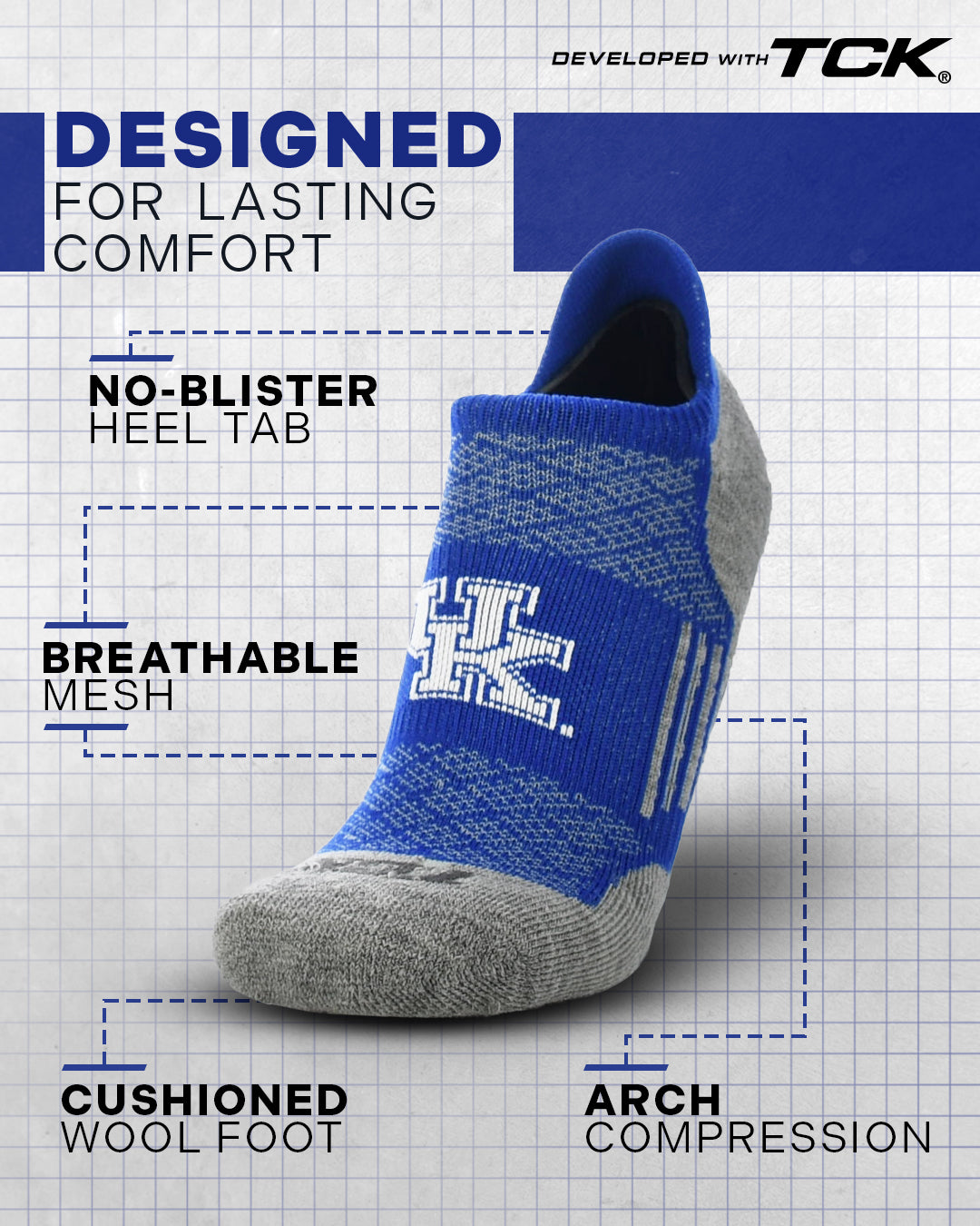 Step up your sock game with TCK's Kentucky Wildcats no show socks, high performance NCAA sock made in the USA. Designed for sneakerheads, golfers, runners, and fans alike, these socks feature a soft merino wool footbed, breathable mesh upper, arch support, and a smooth toe seam. The heel tab protects without showing. Perfect for all-day comfort, year-round wear, and gifting for birthdays, Father’s Day, grads, or Christmas.