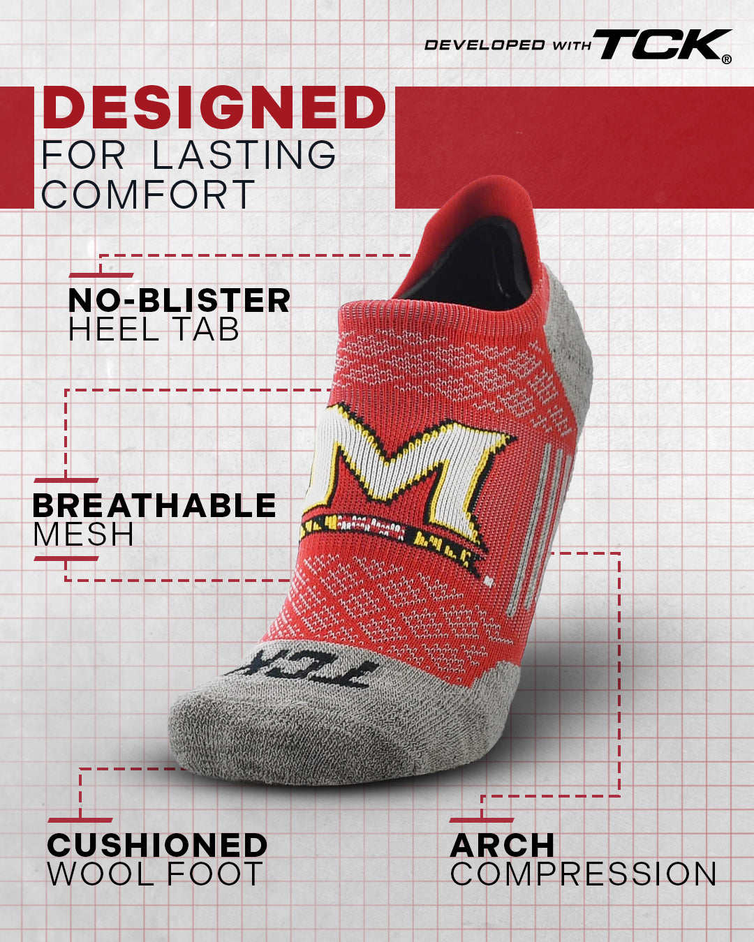 Step up your sock game with TCK's Maryland Terrapins no show socks, high performance NCAA sock made in the USA. Designed for sneakerheads, golfers, runners, and fans alike, these socks feature a soft merino wool footbed, breathable mesh upper, arch support, and a smooth toe seam. The heel tab protects without showing. Perfect for all-day comfort, year-round wear, and gifting for birthdays, Father's Day, grads, or Christmas.