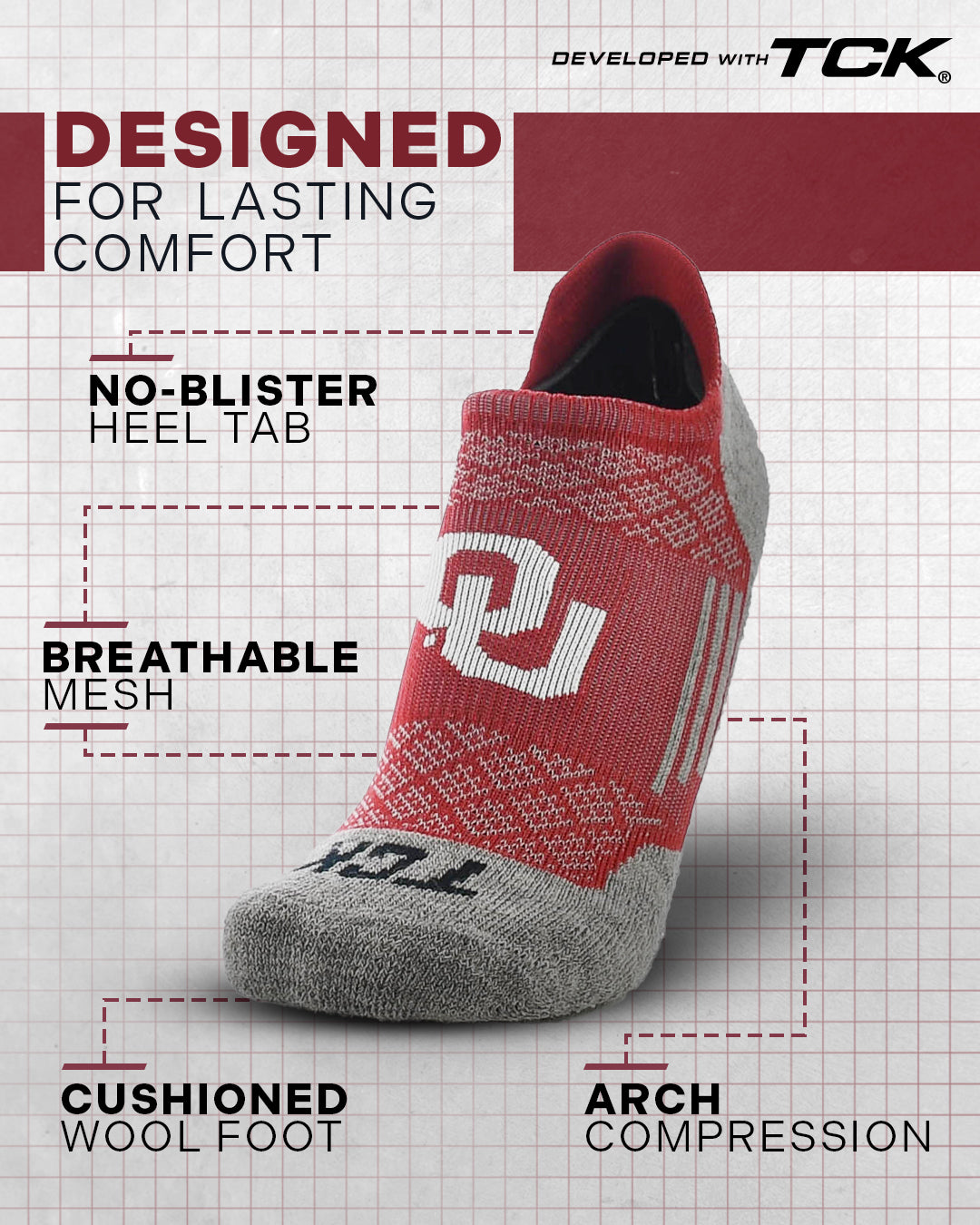 Step up your sock game with TCK's Oklahoma Sooners no show socks, high performance NCAA sock made in the USA. Designed for sneakerheads, golfers, runners, and fans alike, these socks feature a soft merino wool footbed, breathable mesh upper, arch support, and a smooth toe seam. The heel tab protects without showing. Perfect for all-day comfort, year-round wear, and gifting for birthdays, Father's Day, grads, or Christmas.