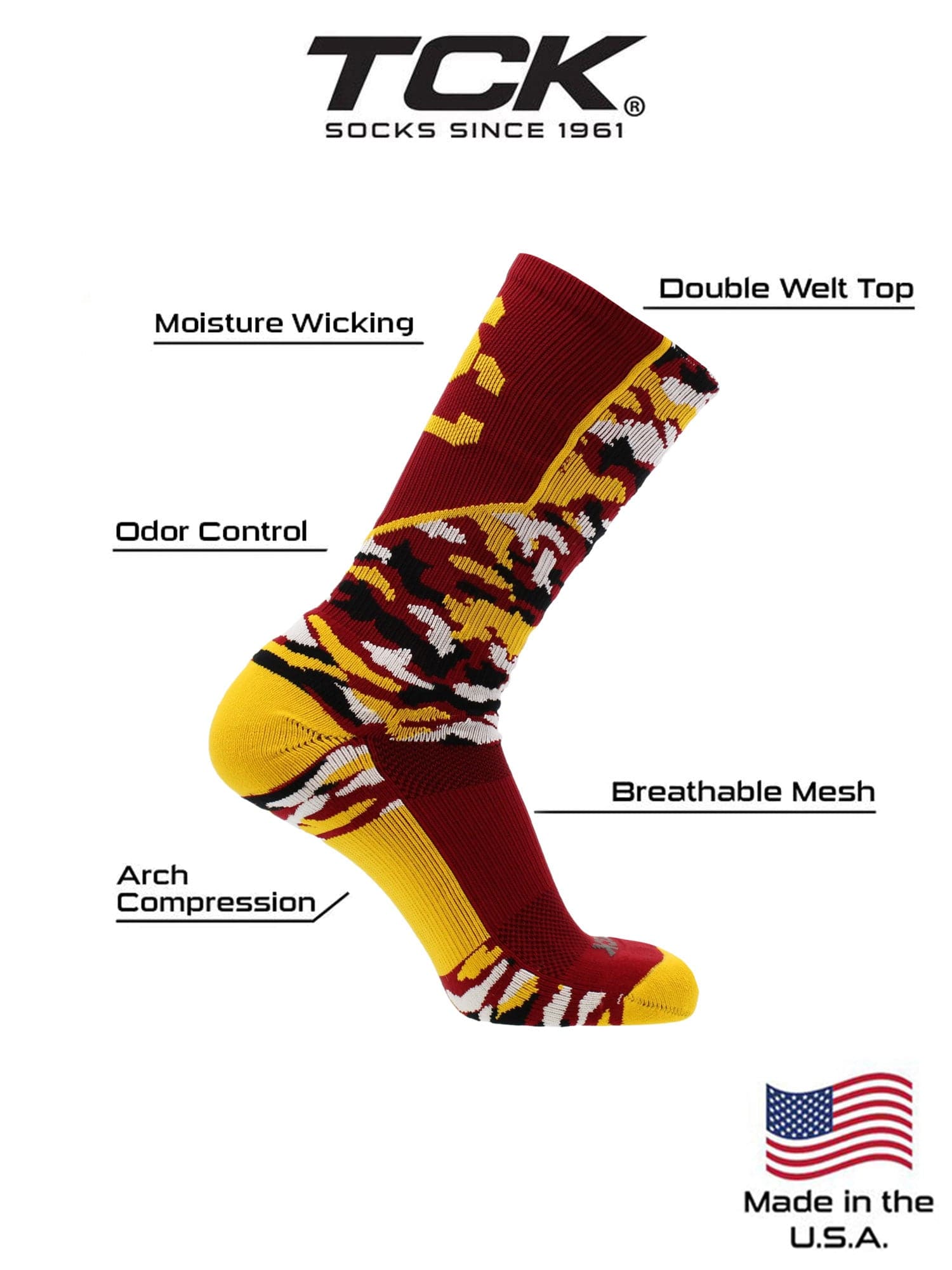 Fight On in Elite Comfort From the historic peristyle of the Los Angeles Memorial Coliseum to the final notes of "Conquest," represent the University of Southern California with the ultimate gameday apparel. These high-performance crew socks feature a rugged woodland camo design in authentic USC Cardinal and Gold, making them a must-have for every member of the Trojan Family. Whether you're watching Traveler gallop across the field or joining the crowd in a thunderous "Fight On!" chant, show your pride from head to toe.