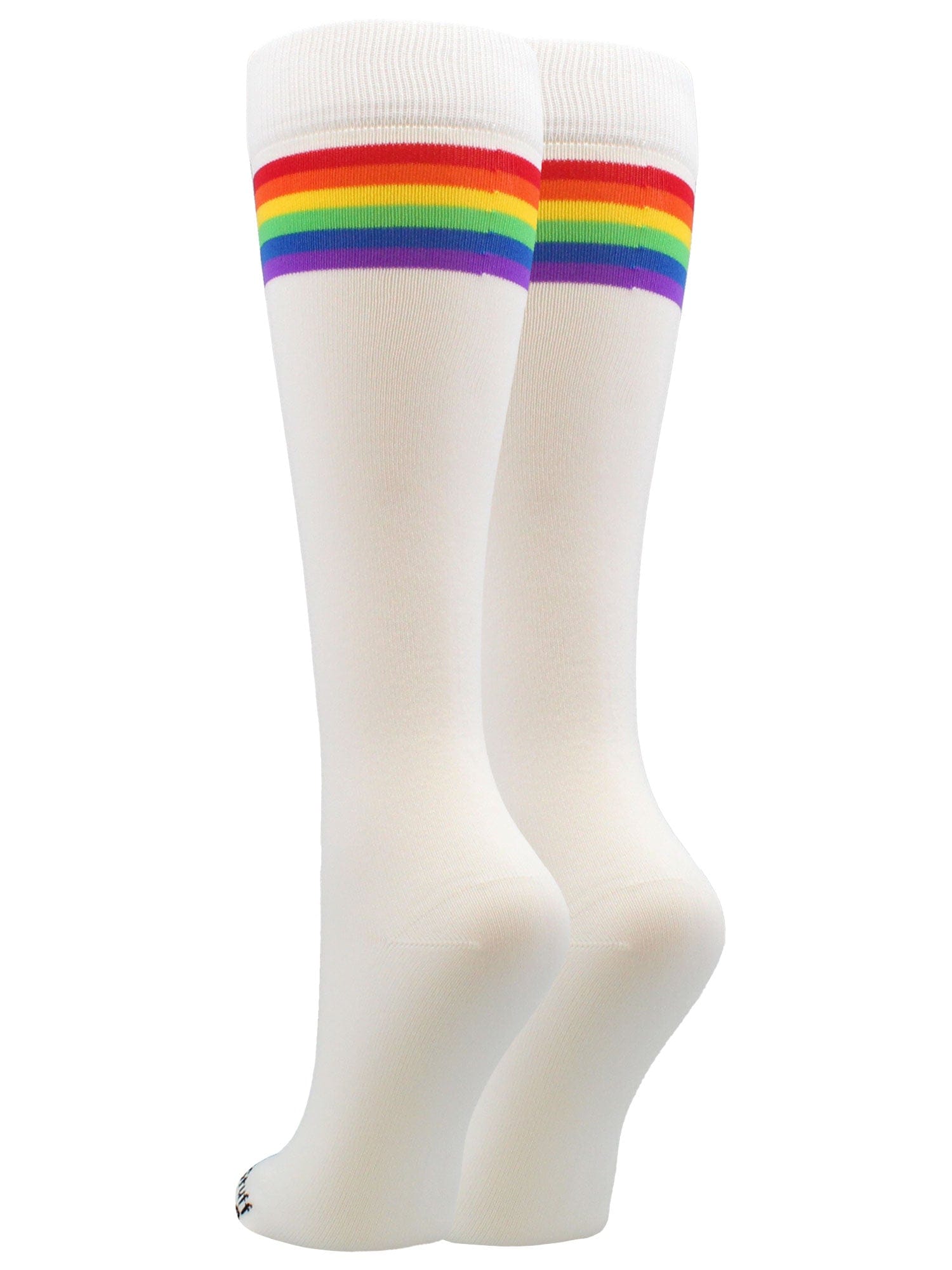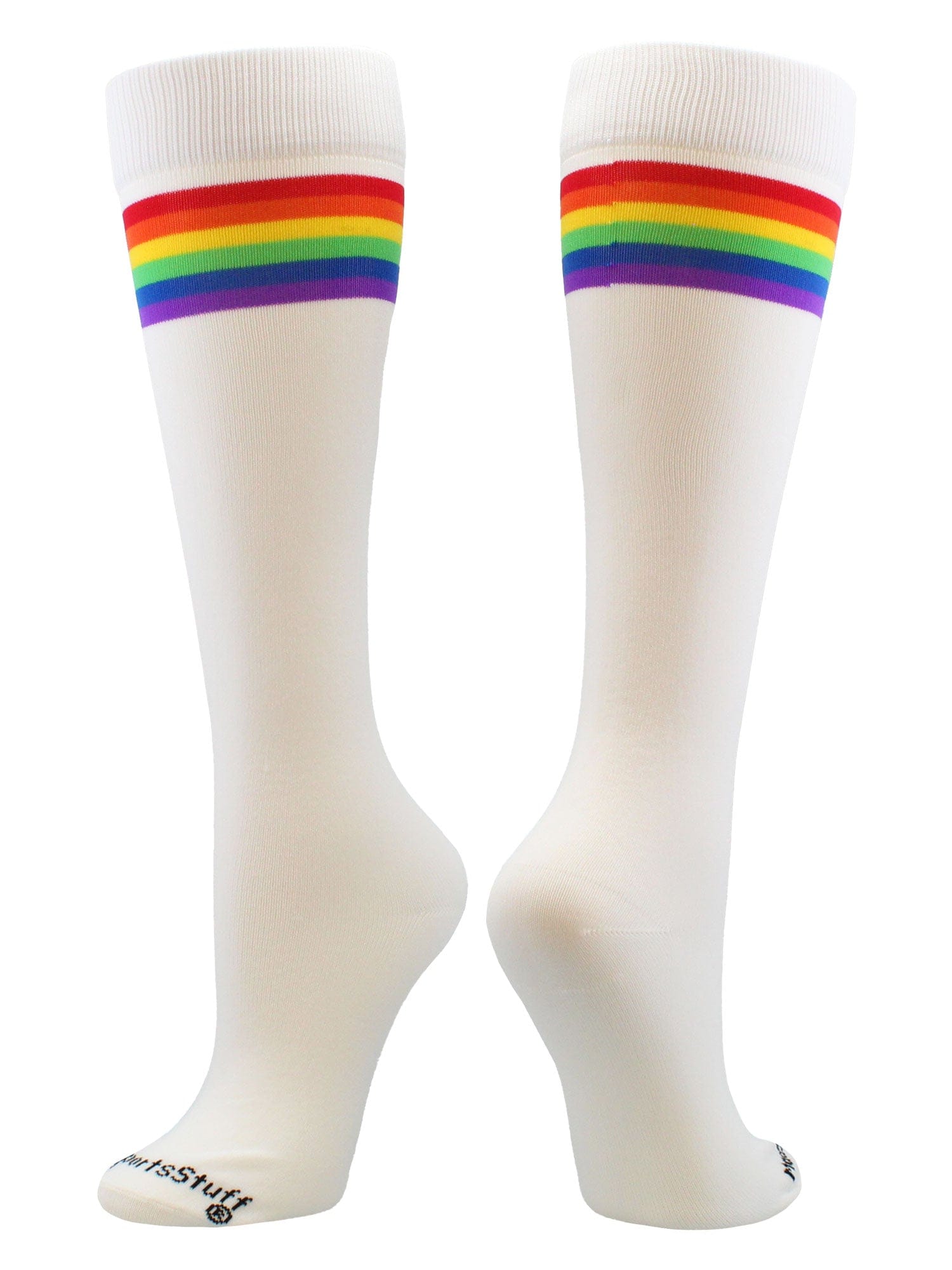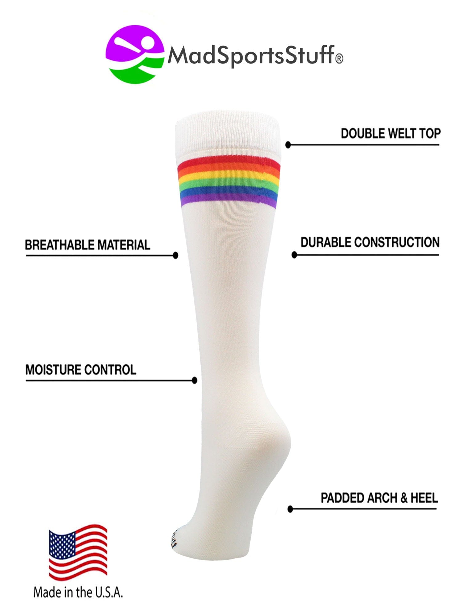 MadSportsStuff Rainbow Socks with Stripes. High performance athletic socks for all team sports and elite athletes. Great for teams! Ideal for softball,baseball, lacrosse, basketball, field hockey, volleyball, wrestling, soccer, football, cheer, kickball and more!