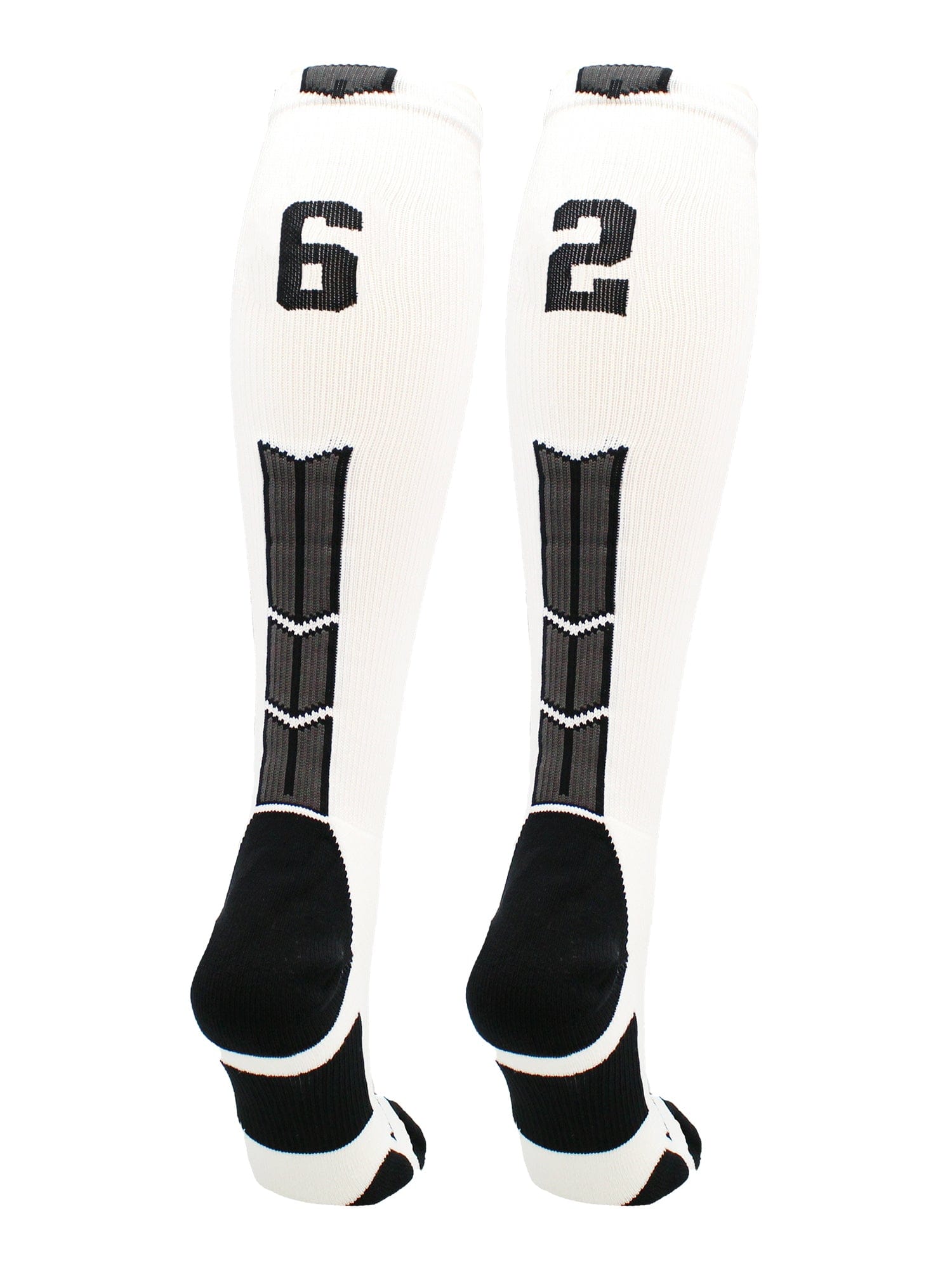 NUMBER SOCKS SOLD AS A PAIR!! MadSportsStuff Player Id Jersey Number Socks Over the Calf Length White and Black. Select your own personalized jersey number. High performance athletic number socks for all team sports and elite athletes. These jersey number socks are ideal for boys and girls and are great for soccer, football, baseball, softball, basketball, volleyball, lacrosse and more!
