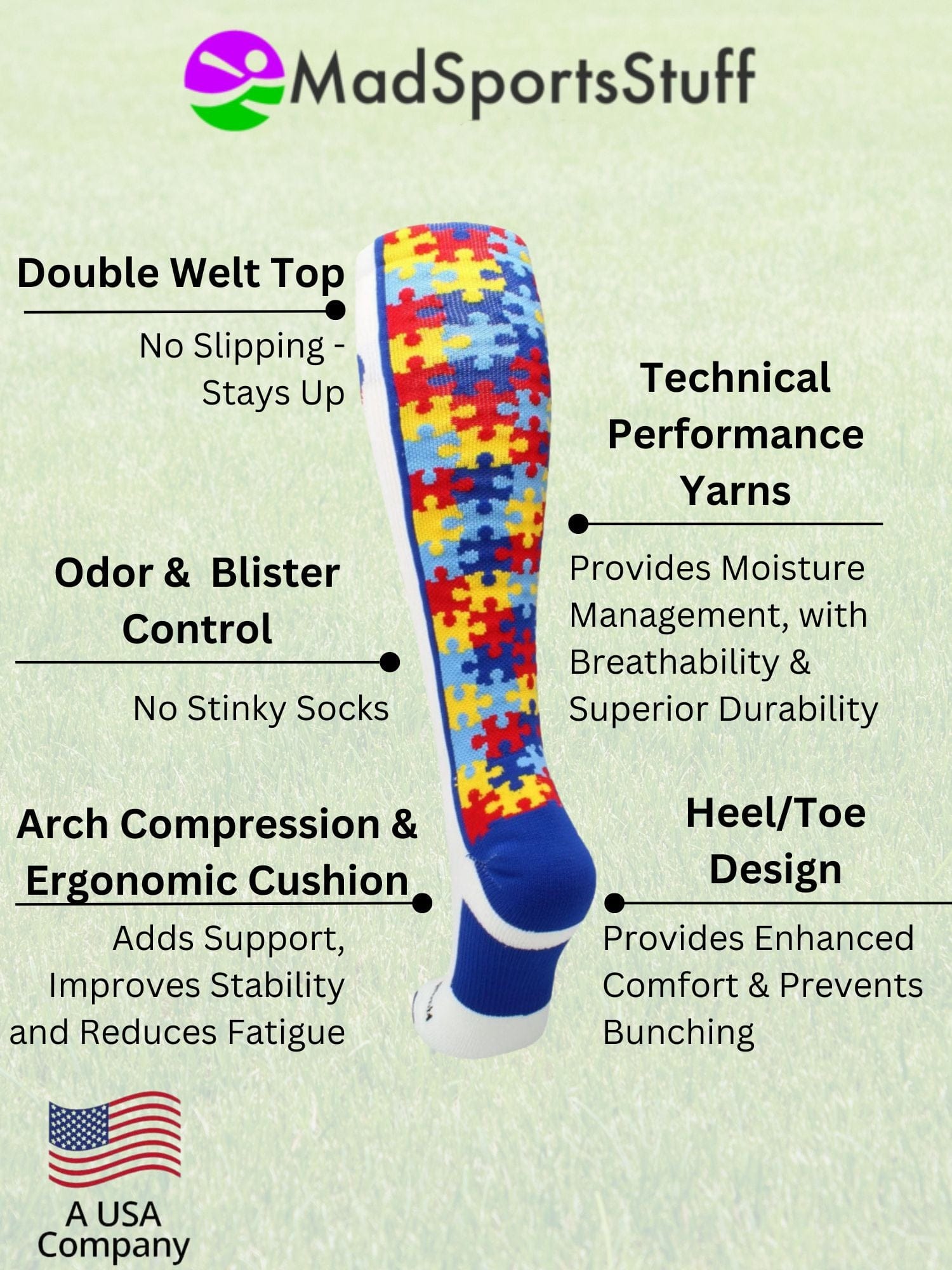 - PERFECT SPORTS AWARENESS SOCKS: These autism awareness socks feature the symbolic puzzle piece design on the back with a puzzle heart on the front to show love and support. Show your support on or off the field (or court)! Great for football, softball, baseball, basketball, lacrosse, volleyball, wrestling, cheer and more!