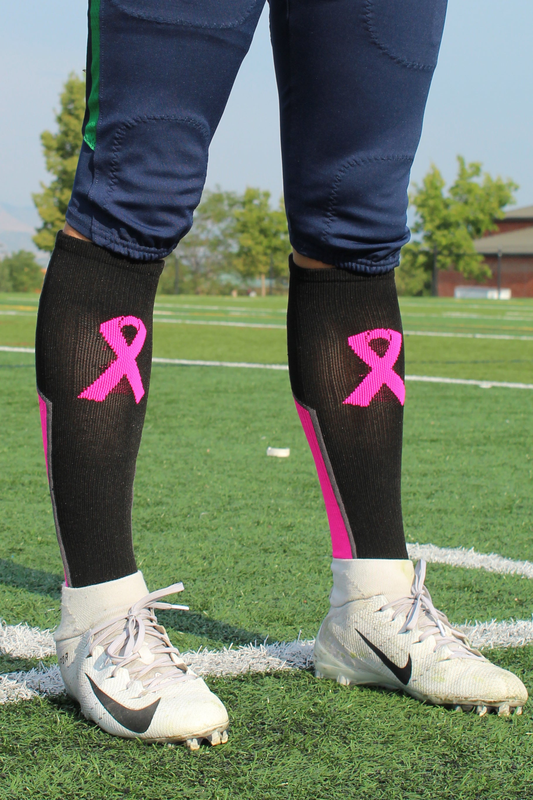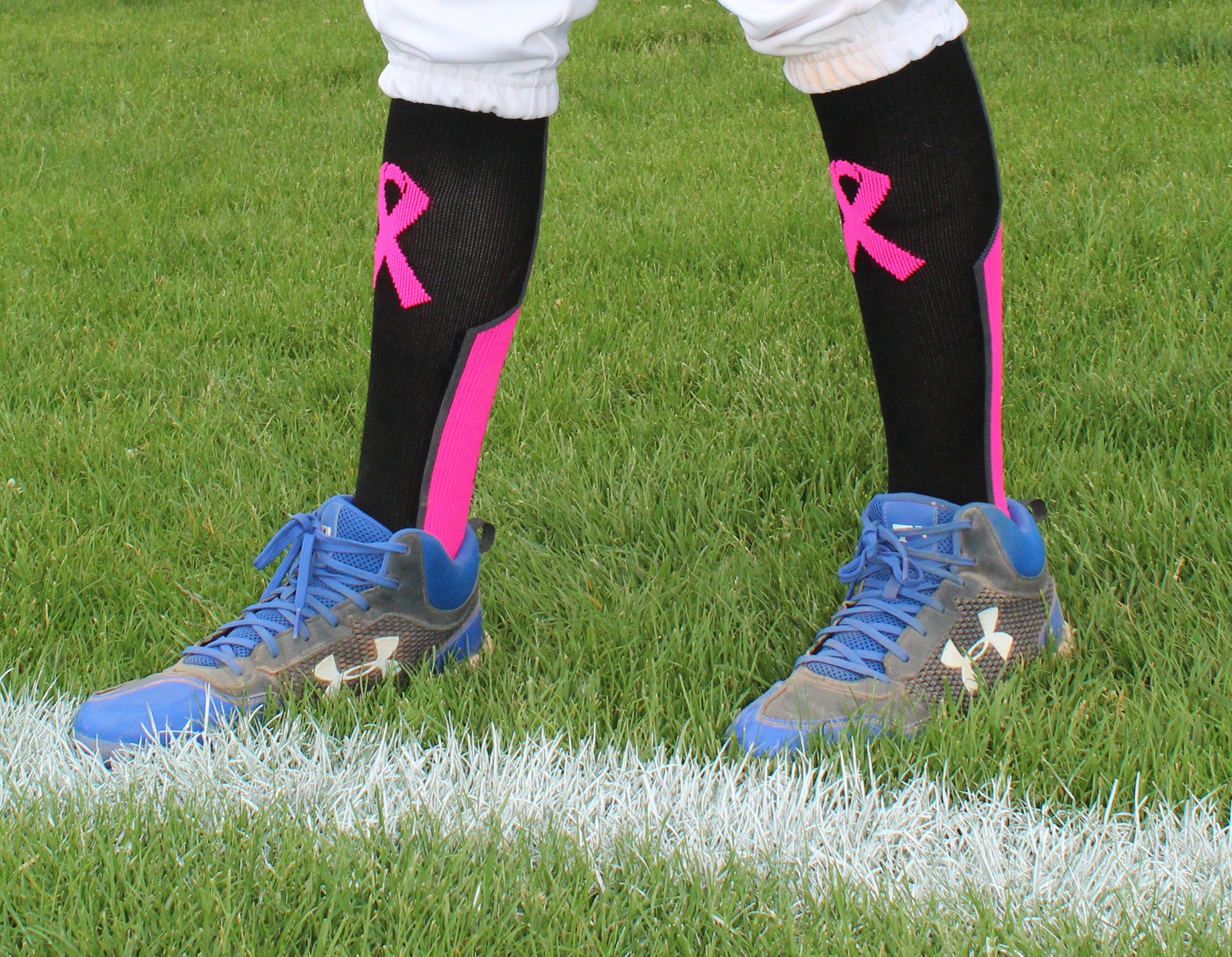MadSportsStuff Pink Ribbon Breast Cancer Awareness Support Athletic Over the Calf Socks. High performance athletic socks for all team sports and elite athletes. This sock is an over the calf length which hits just below the knee. Ideal for football, baseball, softball, soccer, field hockey, basketball, lacrosse, volleyball, wrestling and more!