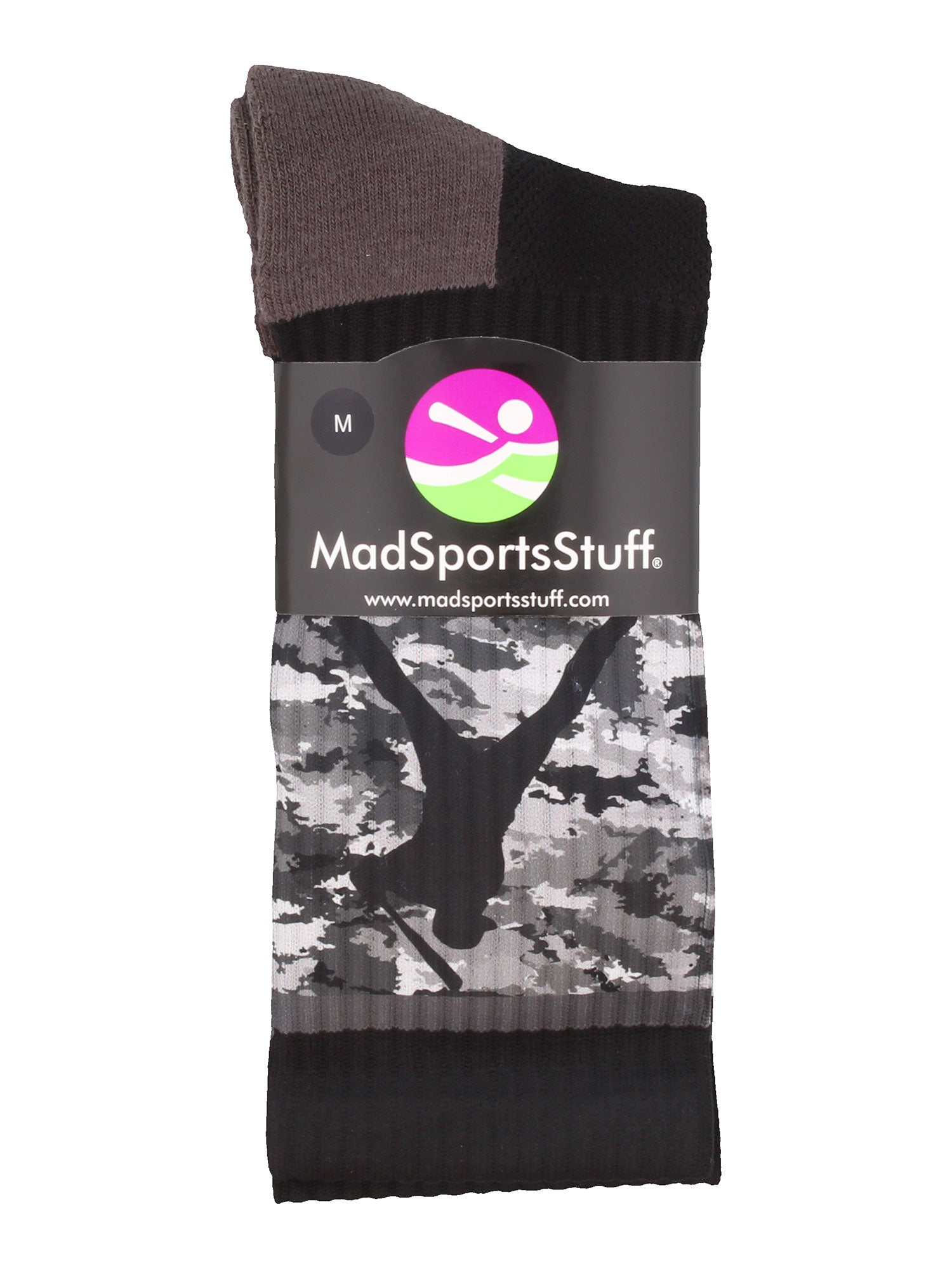 MadSportsStuff Sublimated Boys Baseball Player Athletic Crew Socks on a camo background. High performance athletic socks for all team sports and elite athletes.