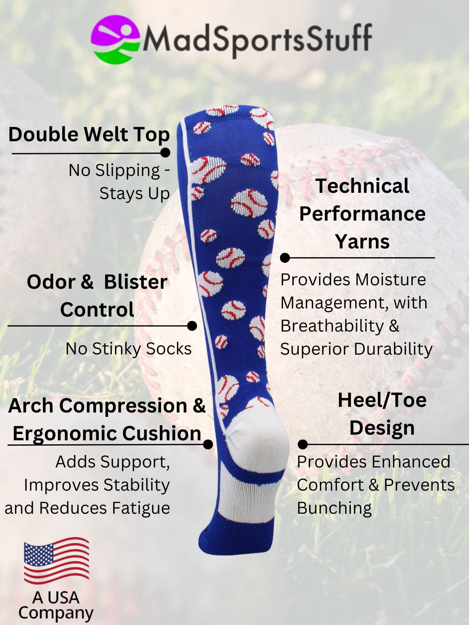 MadSportsStuff Crazy Baseball Socks with Baseballs Logo Over the Calf. High performance crazy Baseball socks for all team sports and elite athletes. These crazy Baseball socks are great for boys, teams and gifts.
