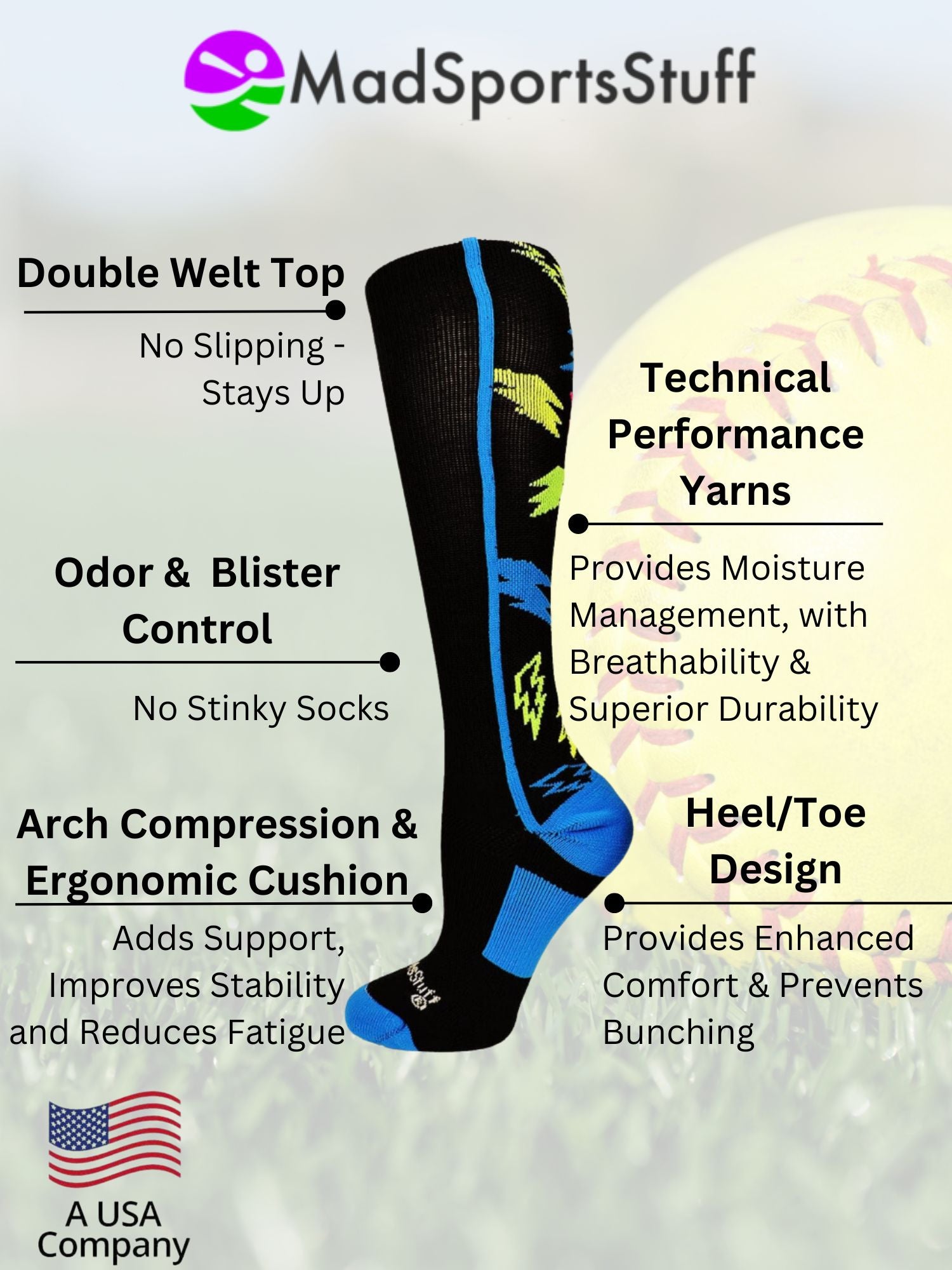 MadSportsStuff Crazy Socks with Lightning Bolts. High performance athletic socks for all team sports and elite athletes. Great for boys or girls, teams and gifts.