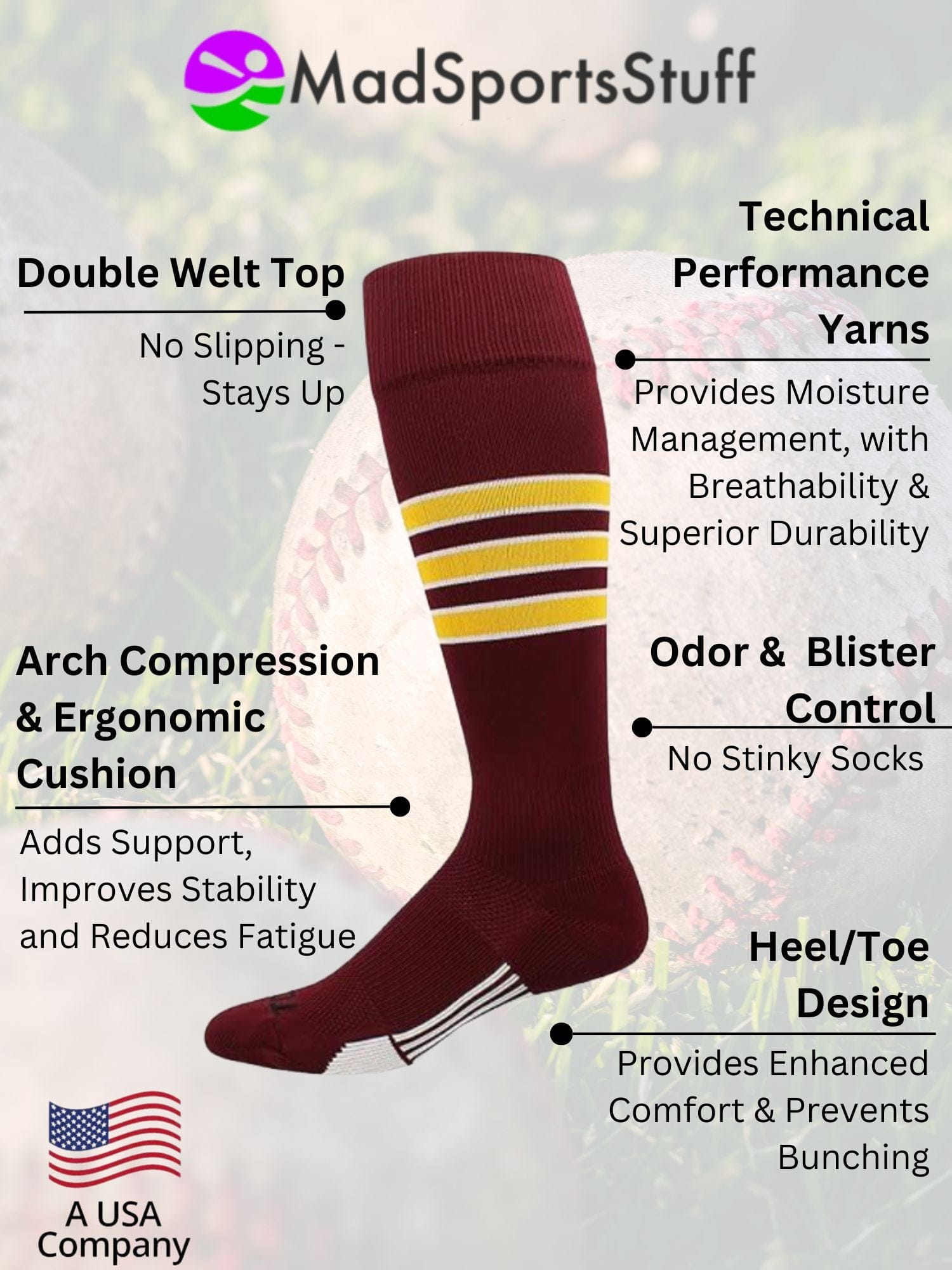 - PERFECT BASEBALL or SOFTBALL SOCKS: MadSportsStuff created world class baseball socks in a classic 3 stripe design with a featheredge in an over the calf length. These baseball socks are offered in classic team colors and are sure to be a hit with your favorite baseball or softball player! These are also an excellent choice for team socks.
