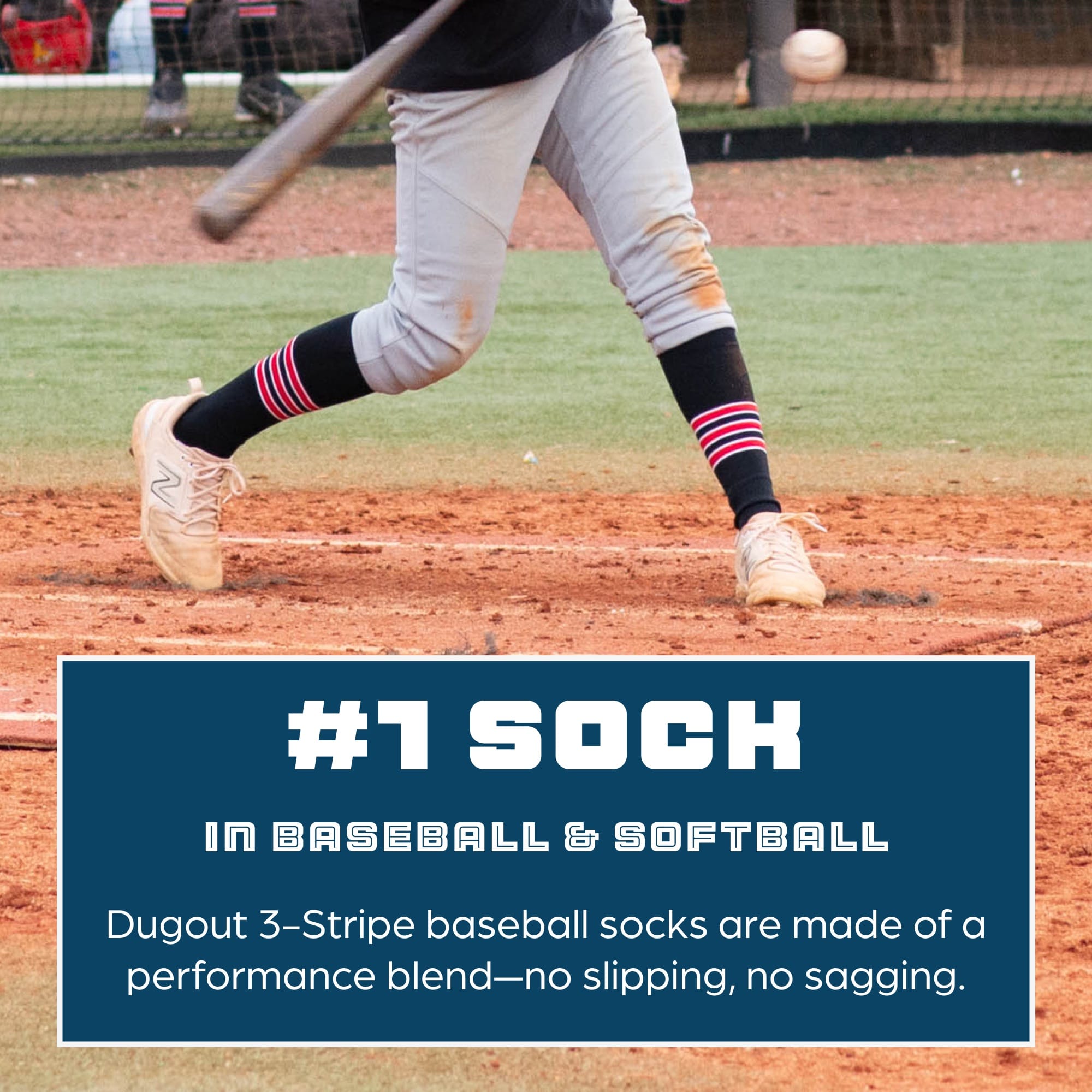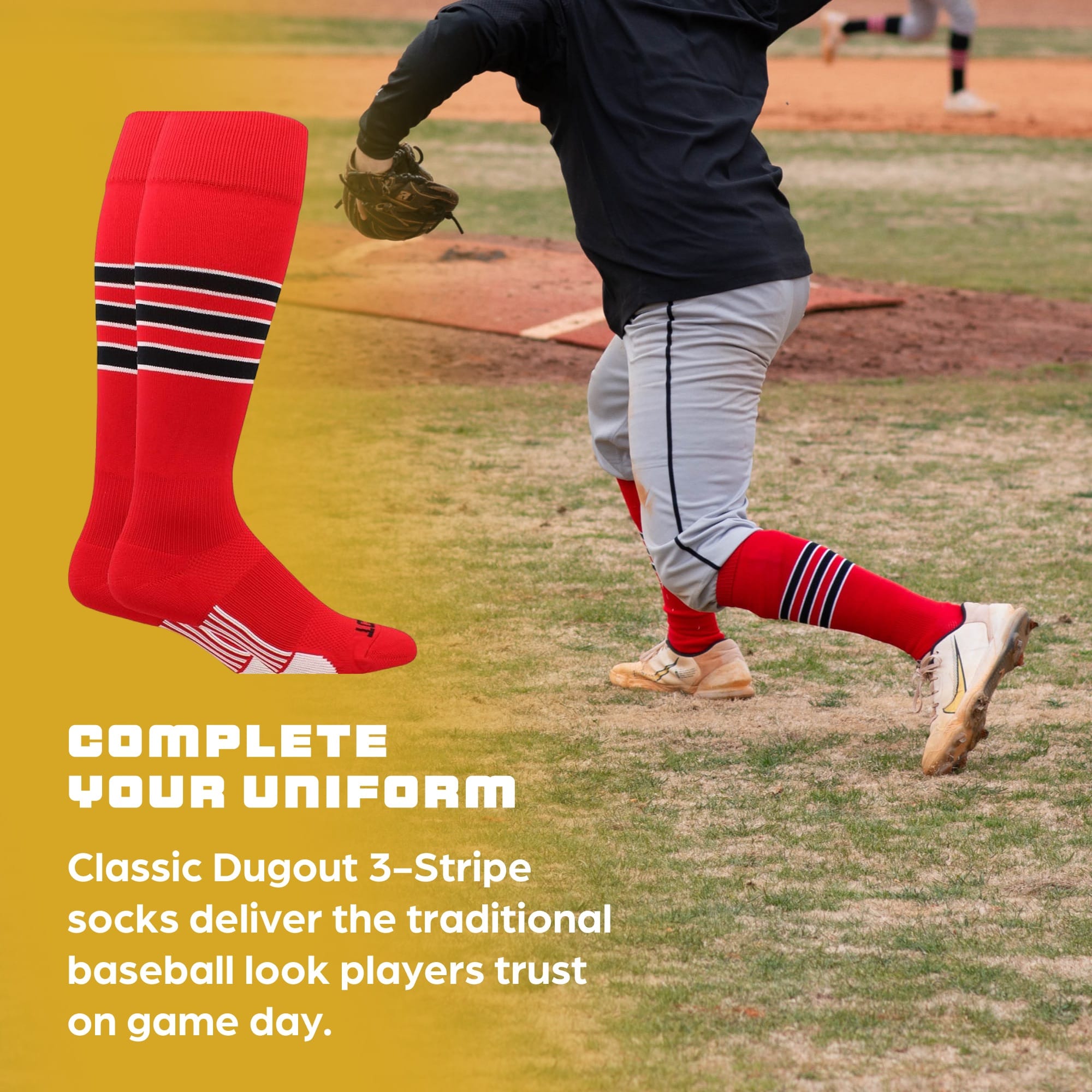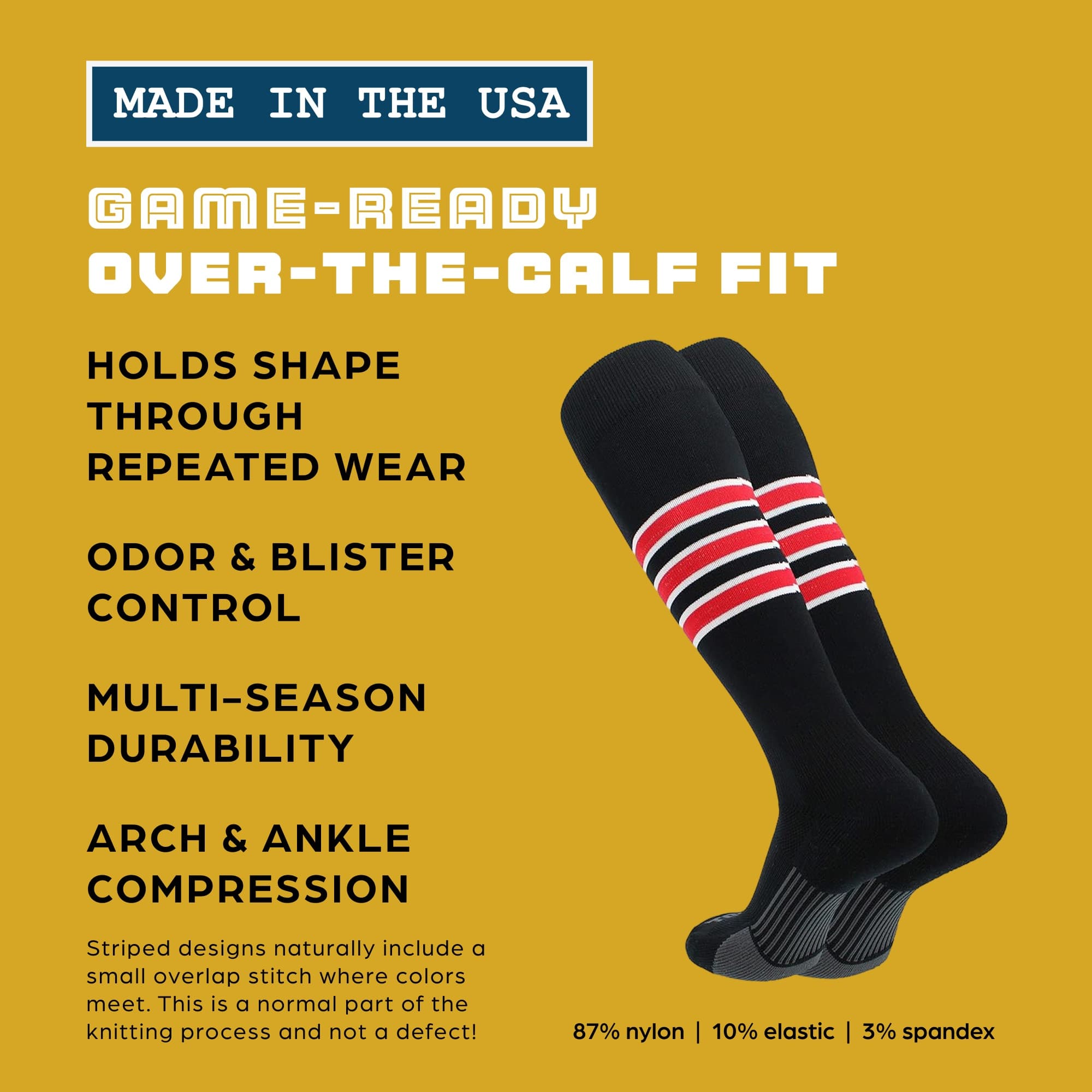 - QUALITY CONSTRUCTION: Our Dugout 3 Stripe Baseball Socks are made in the USA. ***NOTE- Please be aware any products produced with stripes (Socks or Stirrups) WILL have an overlap/stairstep stitching area on every stripe. This is inherent to the knitting process and is unavoidable. Please note this is NOT a defect in the product.***