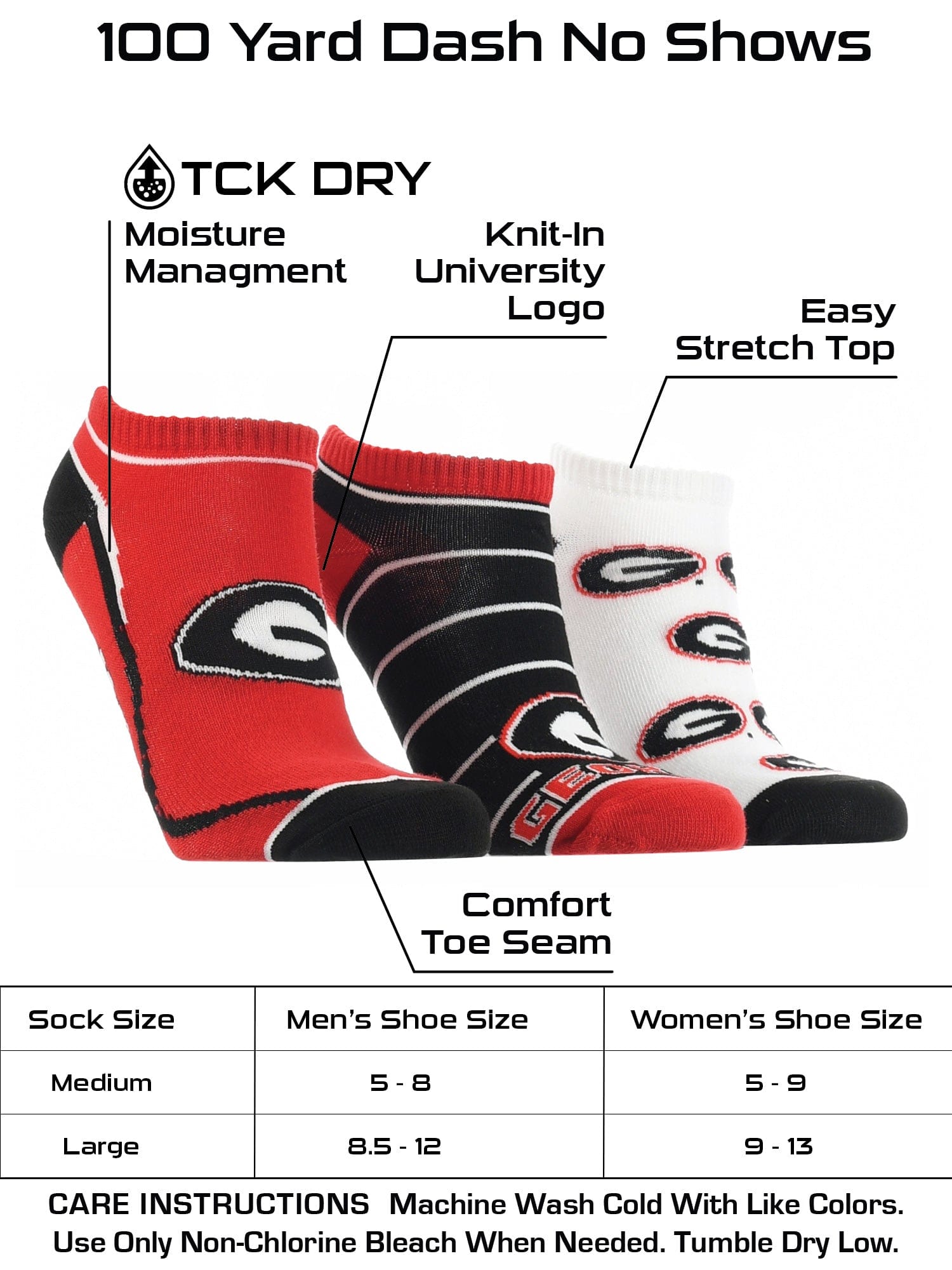 TCK Full Field, No Show Socks come with 3 pairs of comfy socks. Get ready to cheer on your favorite team during the season! Wear these to the tailgate party, working out, or lounge around the house. Offering comfort, breathability, and durability these high quality University of Georgia Bulldogs socks are an ideal gift for birthdays, stocking stuffers or going back to school. Made of 97% Polyester, 3% Spandex. Gear up for the big game! Go Dawgs!