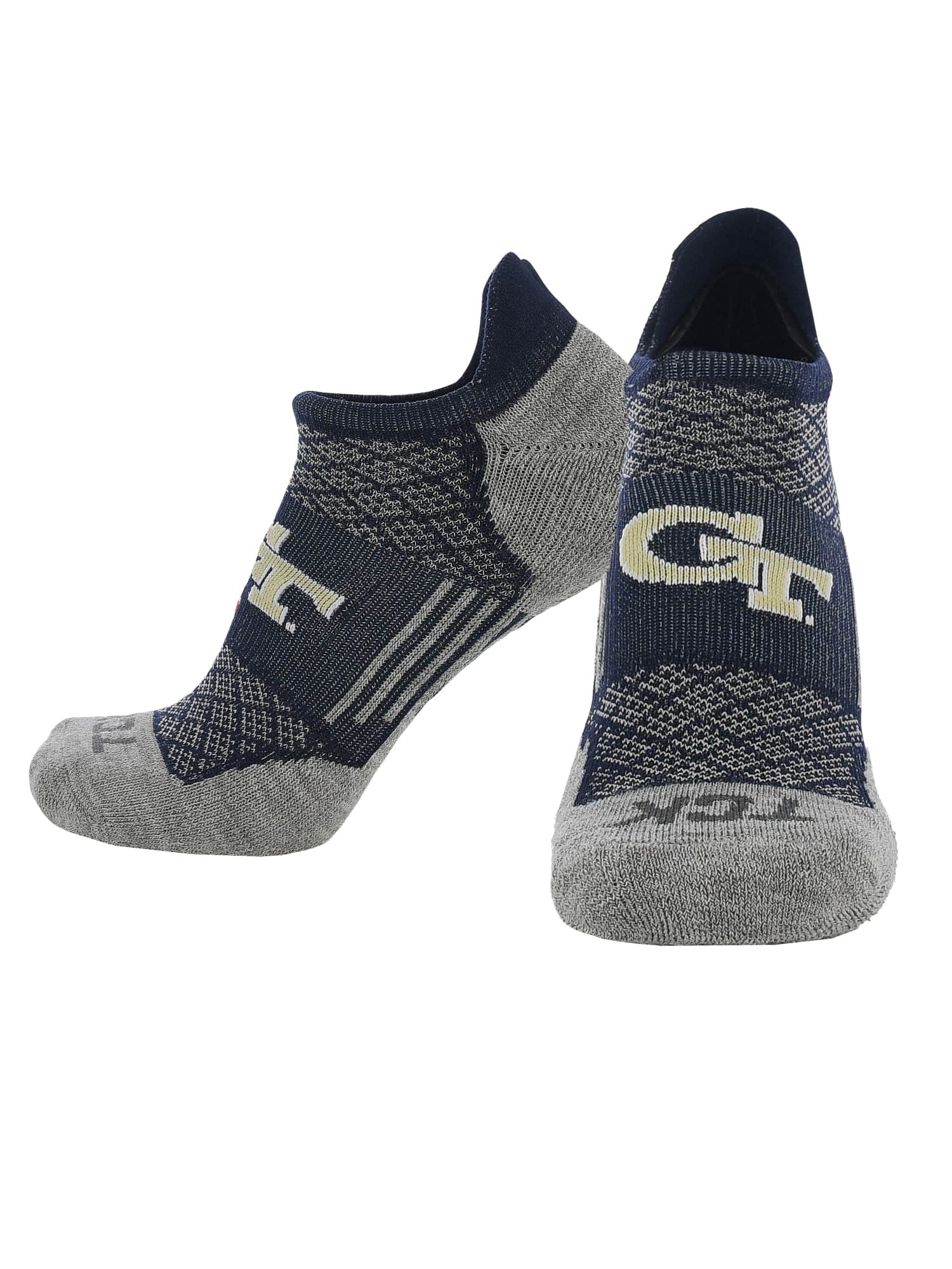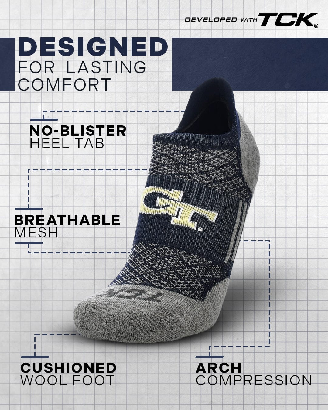Step up your sock game with TCK's Georgia Tech Yellow Jacket no show socks, high performance NCAA sock made in the USA. Designed for sneakerheads, golfers, runners, and fans alike, these socks feature a soft merino wool footbed, breathable mesh upper, arch support, and a smooth toe seam. The heel tab protects without showing. Perfect for all-day comfort, year-round wear, and gifting for birthdays, Father's Day, grads, or Christmas.