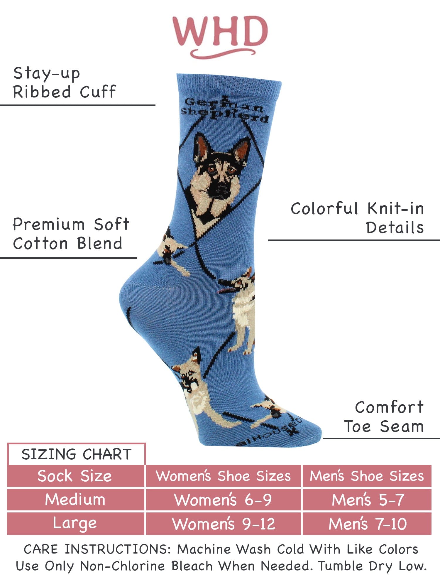 Celebrate the loyal and hardworking spirit of German Shepherds with the best German Shepherd crew socks for dog lovers from Wheel House Designs! These crew socks feature a charming German Shepherd design, capturing the intelligence and protective nature of this iconic breed. Made with a soft cotton blend, they offer all-day comfort and durability. Available in medium (fits women’s shoe sizes 6-9) and large (fits women’s shoe sizes 9-11), these socks are perfect for German Shepherd enthusiasts looking to add a touch of canine elegance to their wardrobe. Whether you’re at the dog park or relaxing at home, these cute German Shepherd socks bring joy to every step. Shop now and enjoy free shipping on your order!