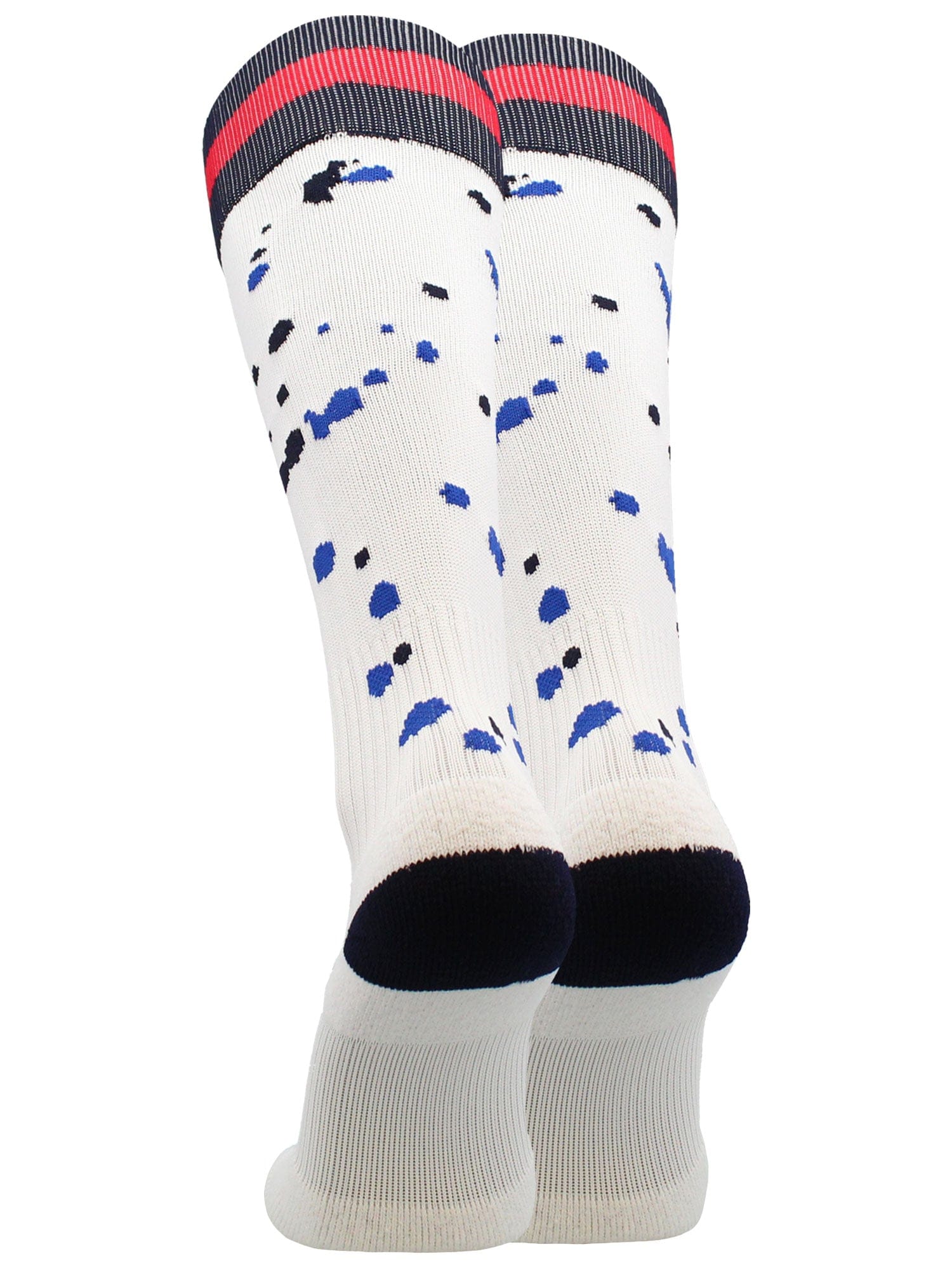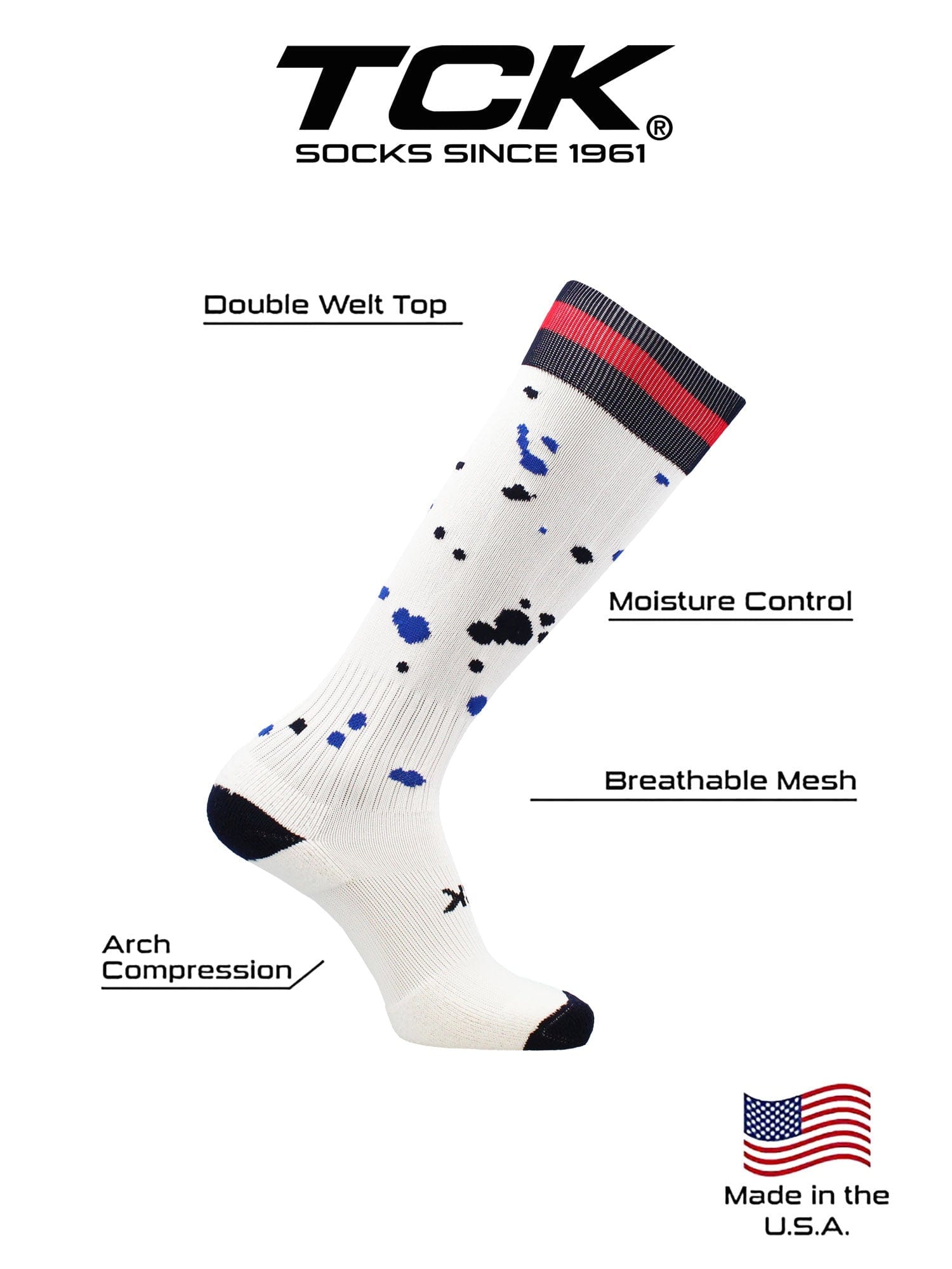 TCK World Cup Soccer Socks are a must have for your next game, outing, or practice. Featuring moisture control yarns, breathable mesh, ergonomic cushion, arch and ankle compression, and a double welt top, they provide maximum athletic performance. These socks are great for youth girls and boys. Designed to match the home jersey of the USWNT, these socks feature a paint platter design. Made with pride in Conover, North Carolina, USA!