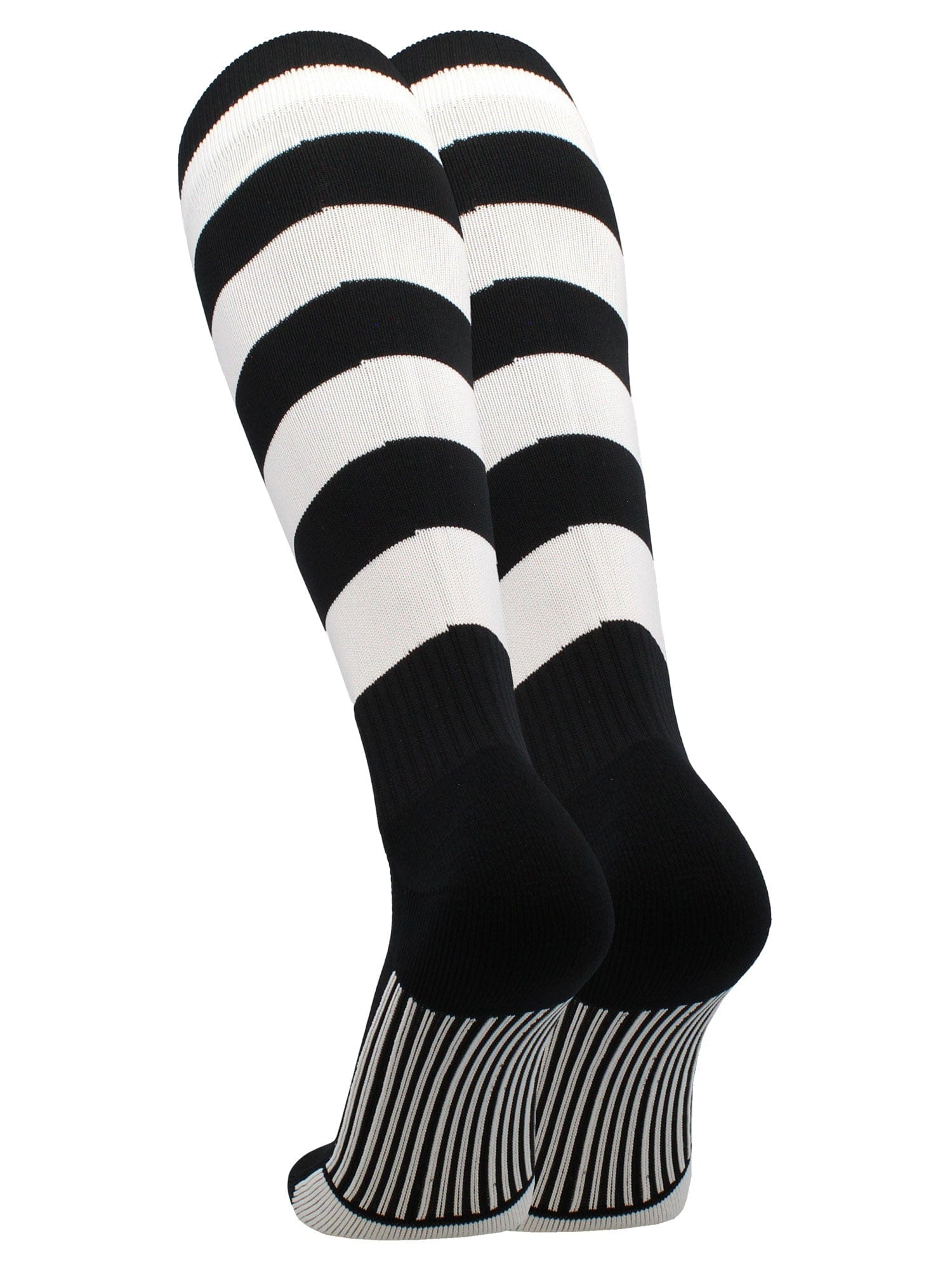 - UPDATED FOR PERFORMANCE: These hoop striped rugby socks and football socks were updated in Spring of 2024 with moisture wicking yarns and new performance enhancing features like arch compression and a padded heel and toe.