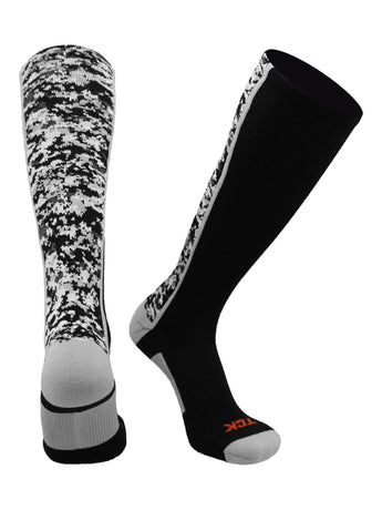 The TCK Digital Camo Over the Calf (OTC) Socks provide professional-grade support and durability for competitive athletes. Designed to meet the demands of high-impact sports, these socks utilize moisture-control yarns and integrated breathable mesh to manage heat and perspiration. With a focus on long-term wearability, the ergonomic cushioning and arch compression provide a secure fit that holds its shape from the first inning to the final whistle. Proudly manufactured in the USA with a high-quality blend of 64% Polypropylene, 27% Nylon, 7% Elastic, and 2% Spandex.