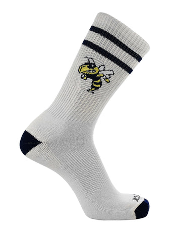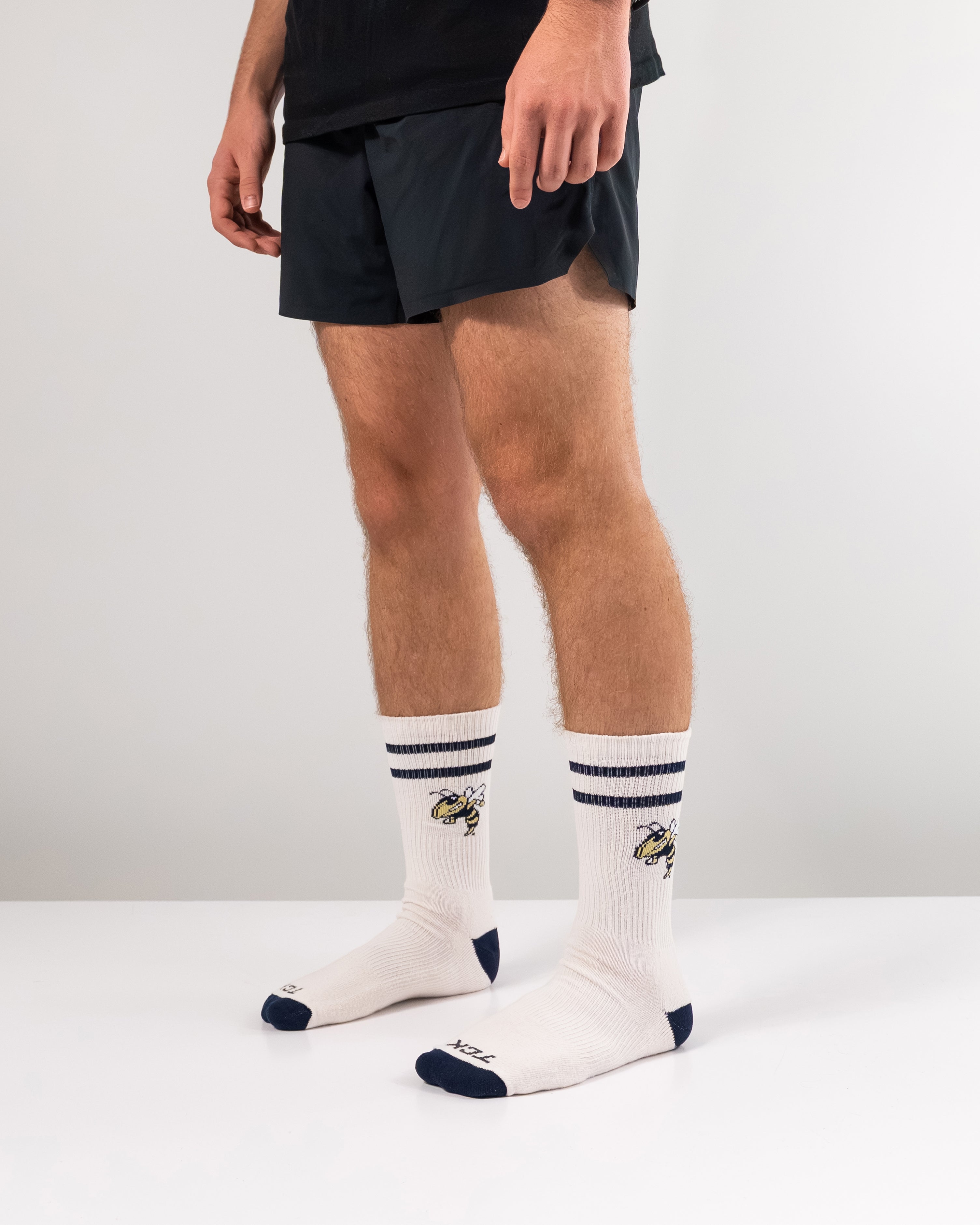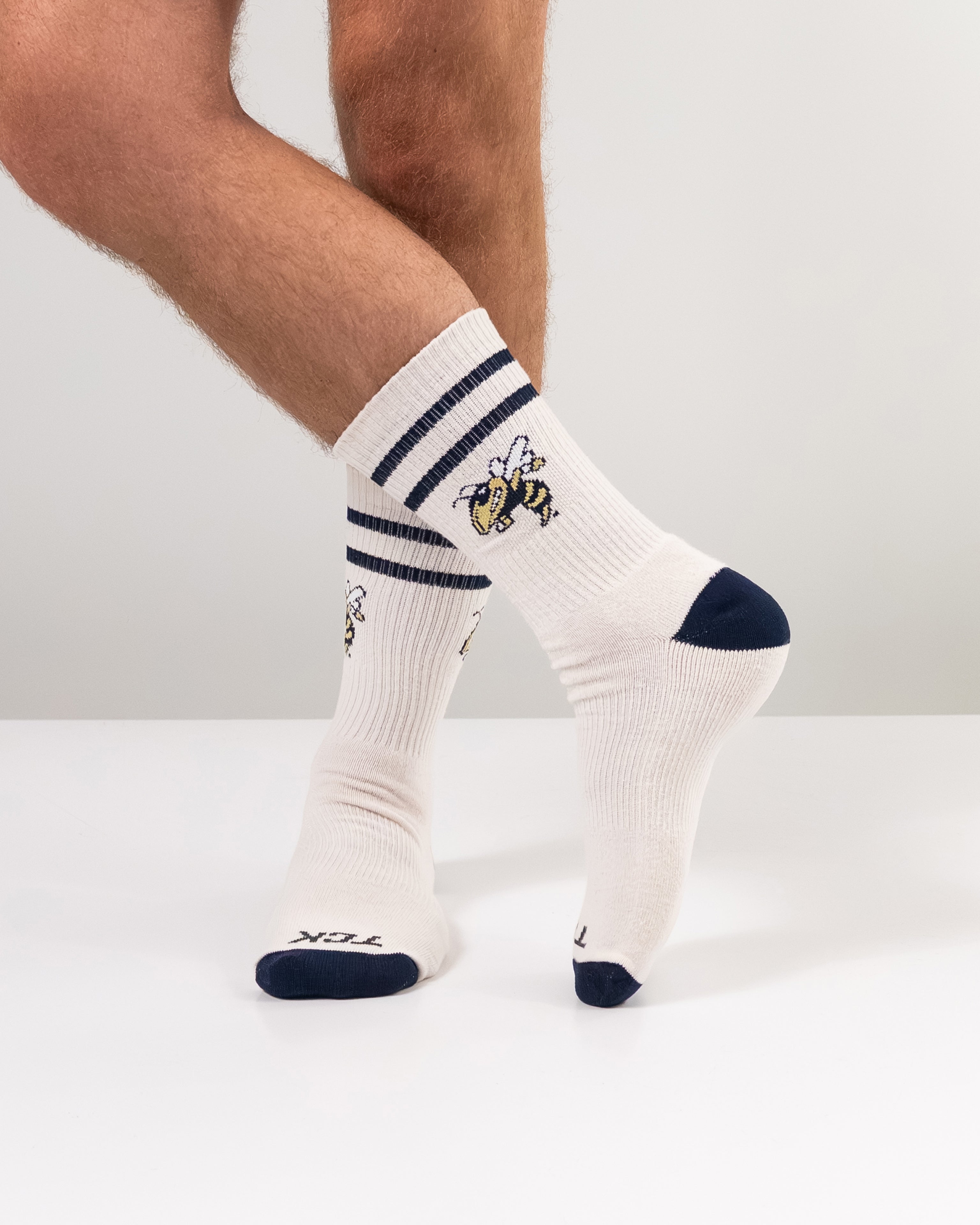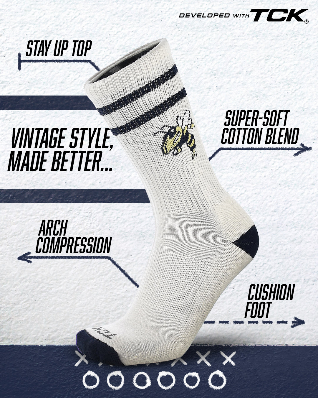 Show off your school pride with these Georgia Tech Yellow Jackets socks. TCK's Vintage NCAA Socks, is a perfect blend of nostalgia and modern comfort. Each pair of TCK socks for Yellow Jackets fans is designed to reflect the history and tradition, making them the perfect addition to any fan's wardrobe. These socks are designed for die-hard fans who appreciate both style and performance. Whether you're cheering from the stands or showing your pride around town, these socks offer the ideal way to support your favorite team. Made with super soft cotton, these socks provide comfort with every step. The arch compression ensures a secure fit, giving you the support you need during any activity. A smooth toe seam prevents irritation, while the breathable mesh design keeps your feet cool and dry. The half cushioned footbed delivers just the right amount of padding, making these socks perfect for all-day wear. Plus, the double welt stay-up top ensures that your socks stay in place, no matter how active you are. Proudly made in the USA, TCK's Vintage NCAA Socks are a testament to quality American manufacturing. Show your true colors and show your pride in these classic, comfortable, and durable socks.