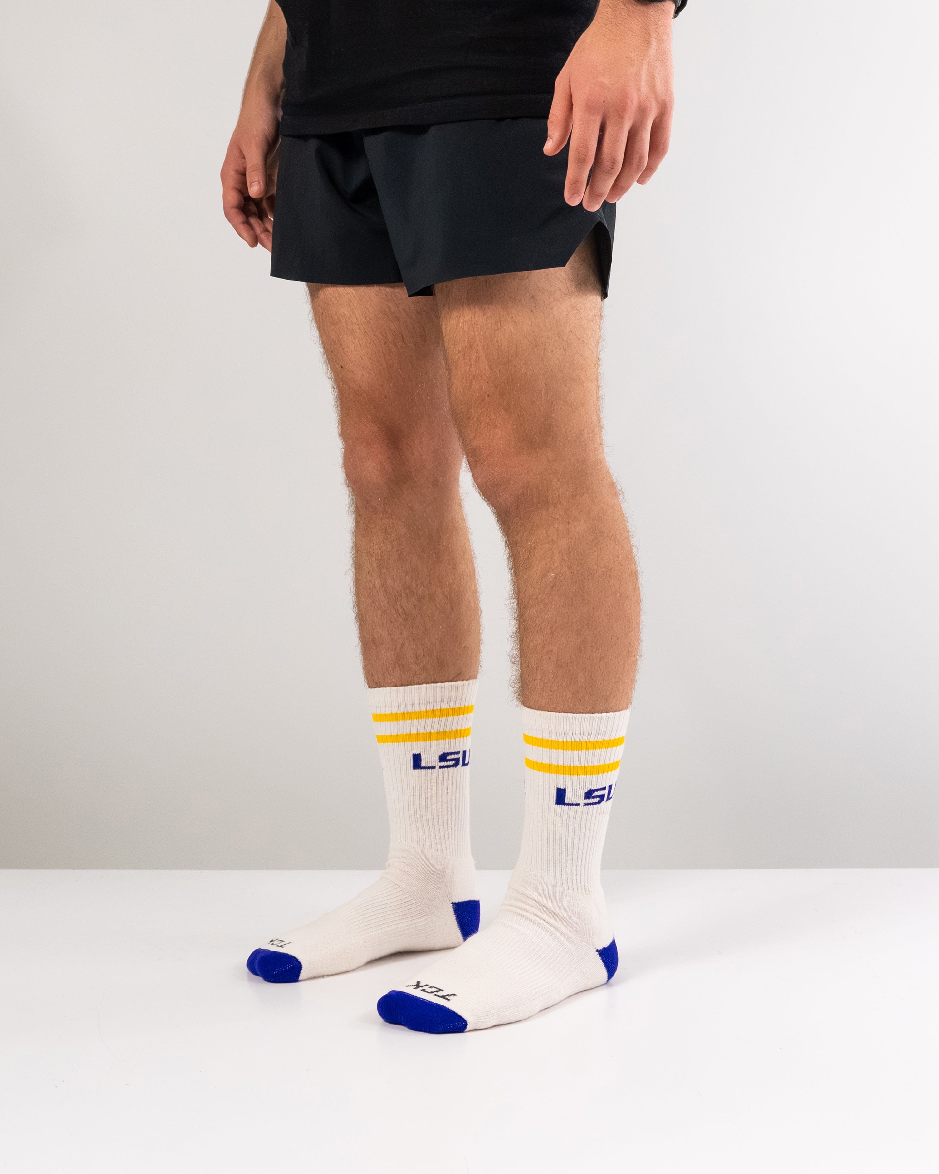 Show off your school pride with these LSU Tigers socks. TCK's Vintage NCAA Socks, is a perfect blend of nostalgia and modern comfort. Each pair of TCK socks for Tiger fans is designed to reflect the history and tradition, making them the perfect addition to any fan's wardrobe. These socks are designed for die-hard fans who appreciate both style and performance. Whether you're cheering from the stands or showing your pride around town, these socks offer the ideal way to support your favorite team. Made with super soft cotton, these socks provide comfort with every step. The arch compression ensures a secure fit, giving you the support you need during any activity. A smooth toe seam prevents irritation, while the breathable mesh design keeps your feet cool and dry. The half cushioned footbed delivers just the right amount of padding, making these socks perfect for all-day wear. Plus, the double welt stay-up top ensures that your socks stay in place, no matter how active you are. Proudly made in the USA, TCK's Vintage NCAA Socks are a testament to quality American manufacturing. Show your true colors and show your pride in these classic, comfortable, and durable socks.